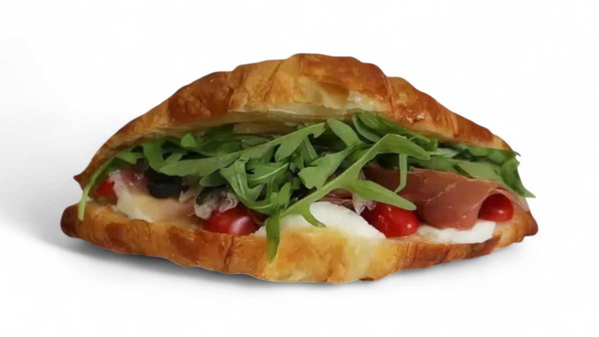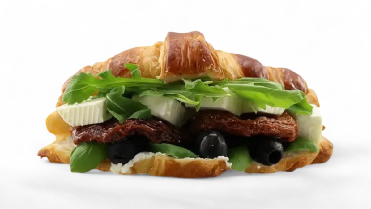 Croissant máslový, krémový sýr, bazalka, sušená rajčata, slaný sýr, olivy, rukola