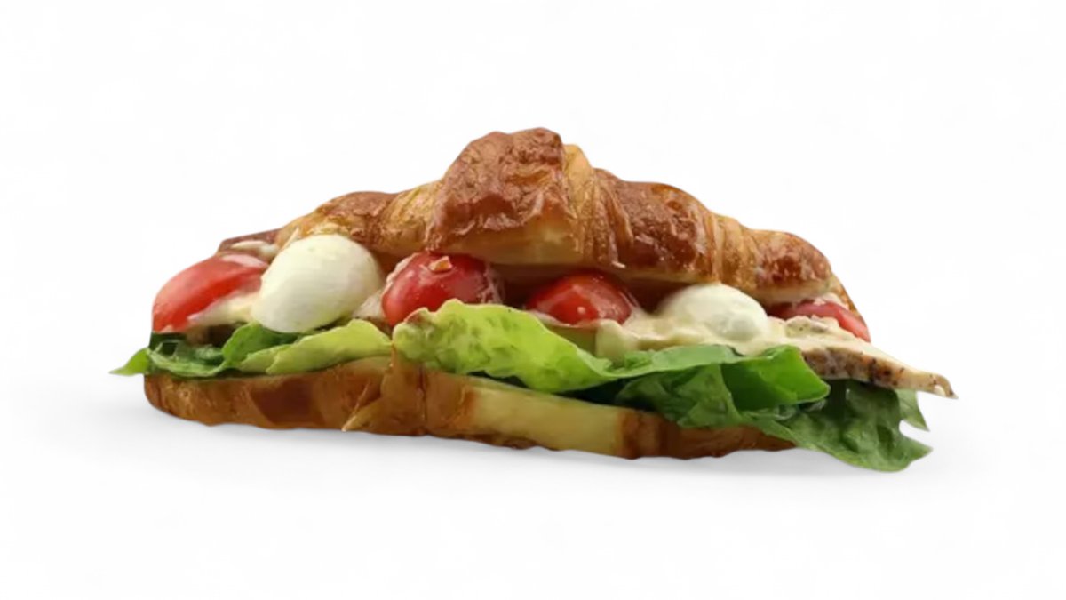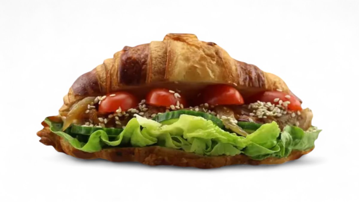 Croissant máslový, salát romen, okurka, grilovaný filet z kuřecích prsou, omáčka teriyaki, karamelizovaná cibule, cherry rajčata, sezam