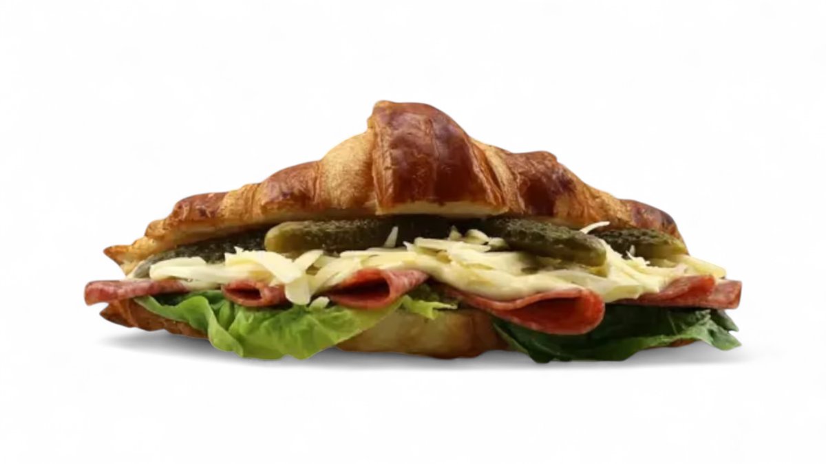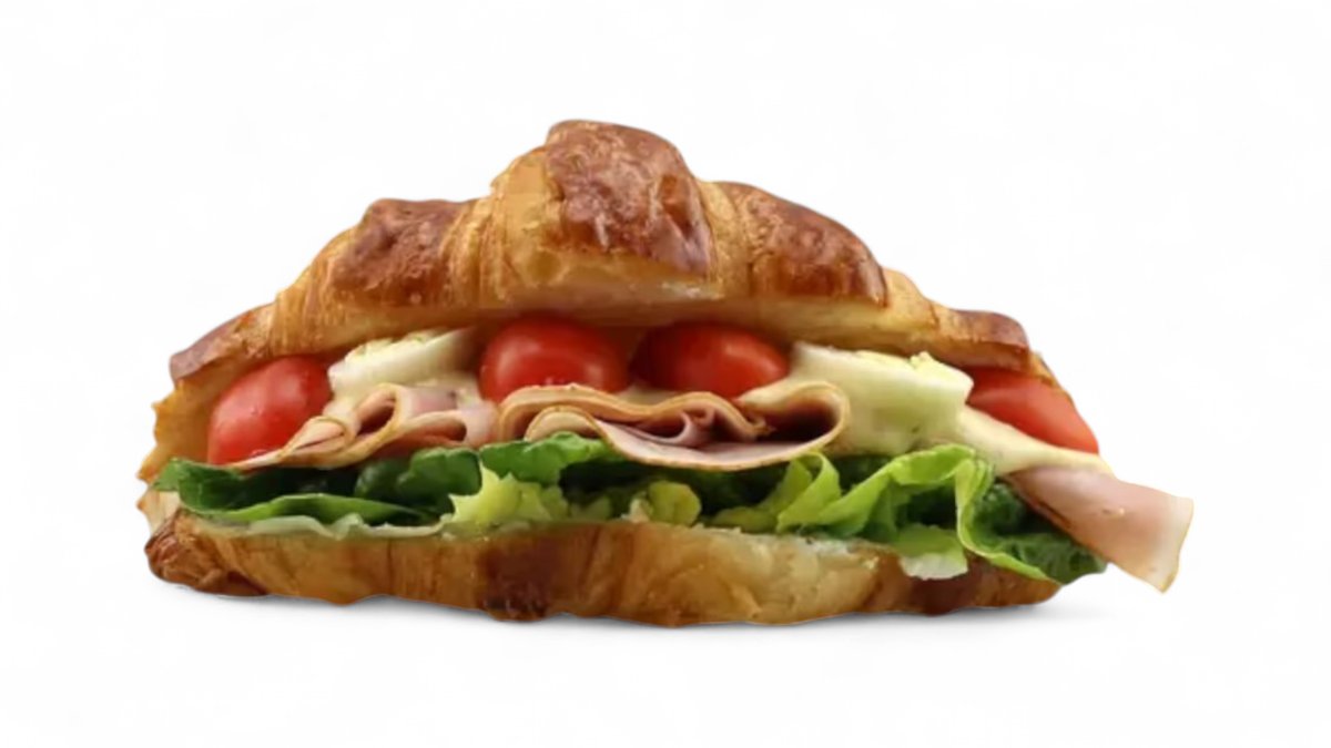 Croissant máslový, salát romen, salám, sýr čedar, majonézová omáčka s hořčicí, kornišony