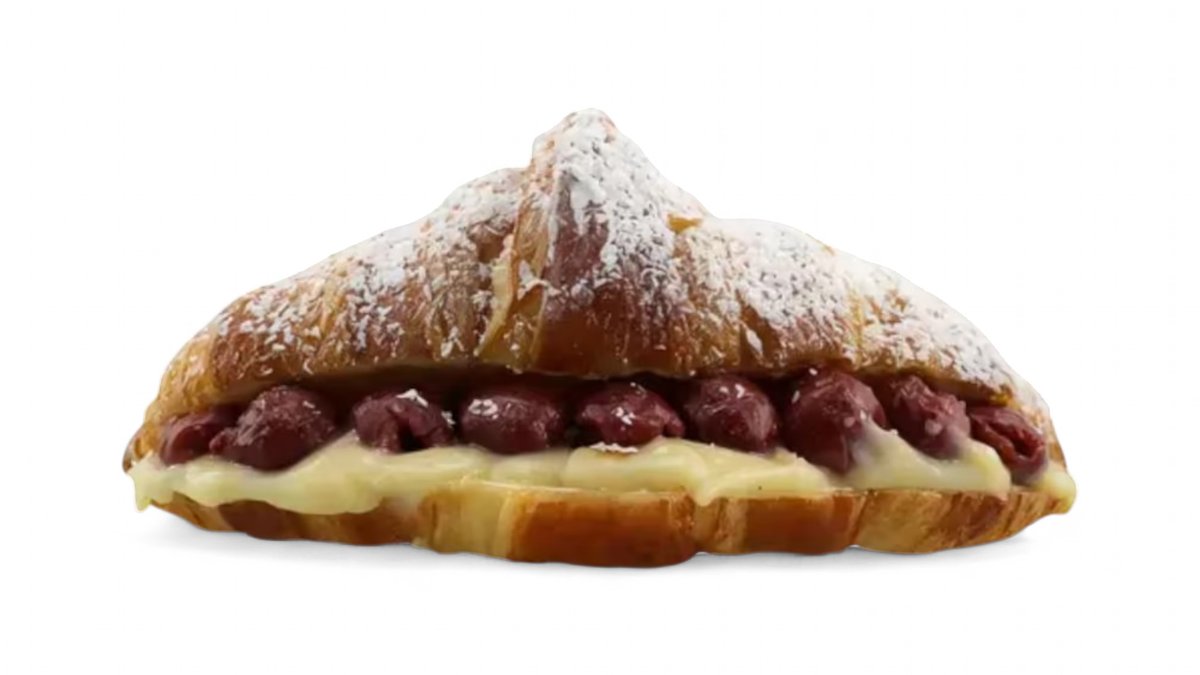 Croissant máslový, pudink, višeň ve vlastní šťávě, moučkový cukr