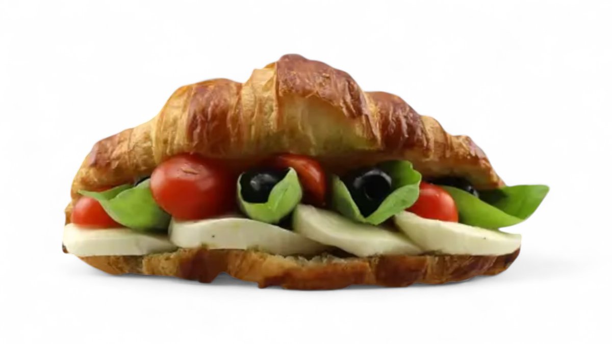 Croissant máslový, omáčka pesto, sýr mozzarella, bazalka, cherry rajčata, olivy, olivový olej