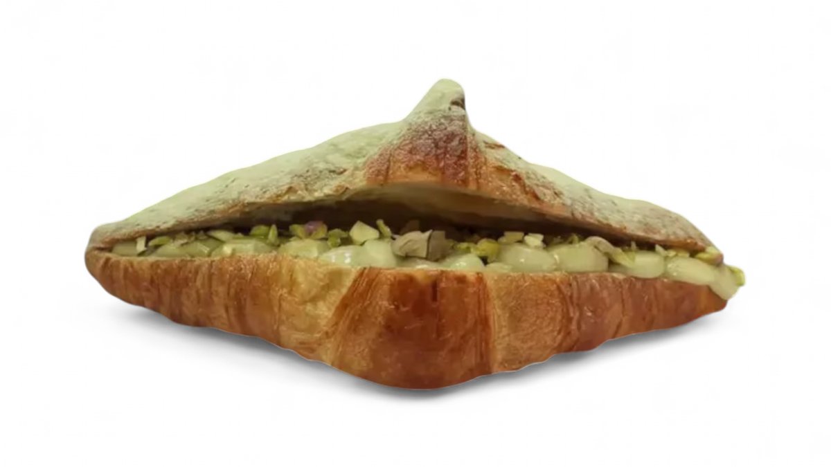 Croissant máslový, pistáciový krém z bílou čokoládou, pistácie matcha a moučkový cukr.