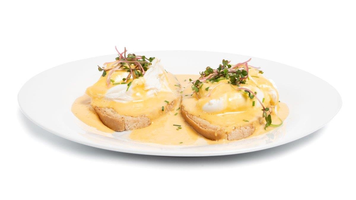 Snído-menu obsahuje 1x Bezlepkové Vejce Benedikt, 1x pomerančový džus/jablečný mošt 0,2l a dezert dle denní nabídky