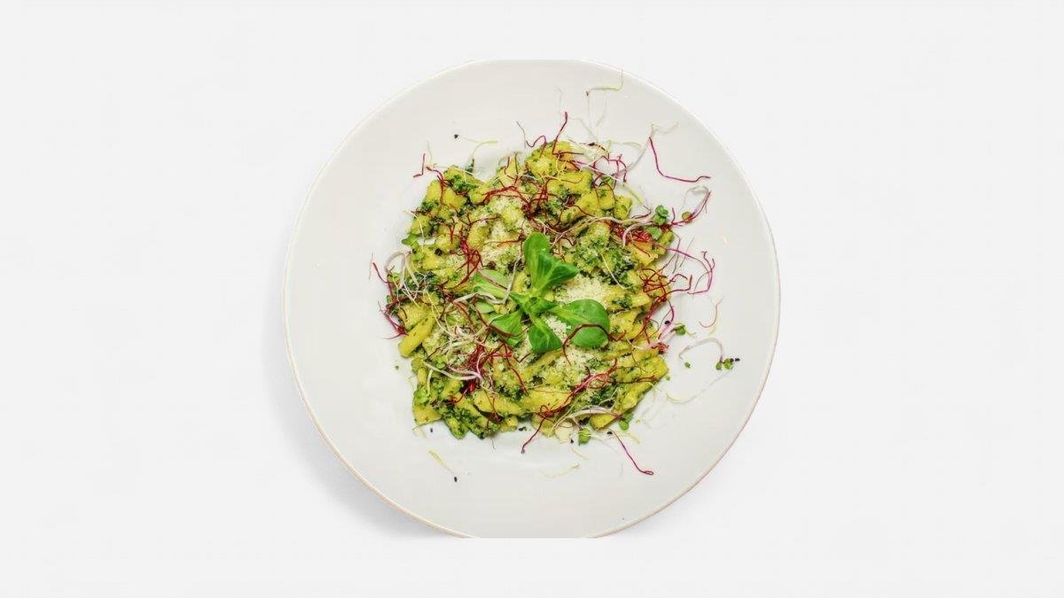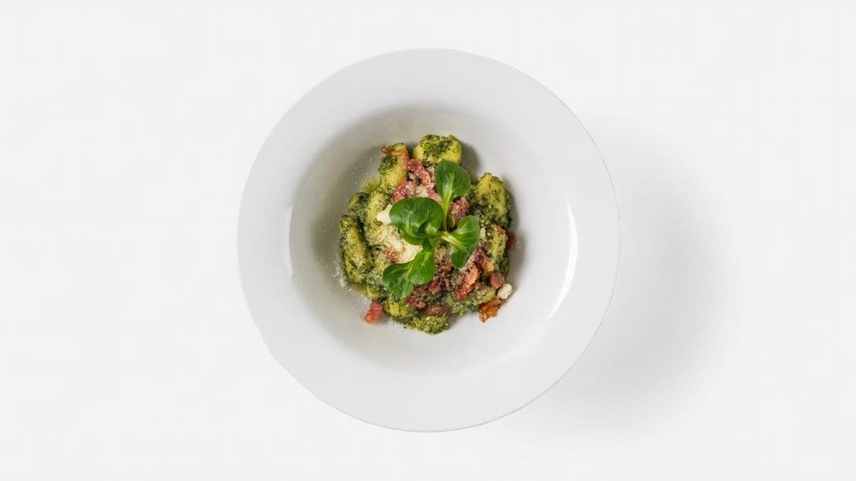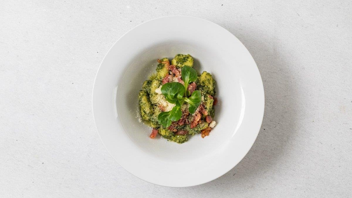 Bezlepkové gnocchi, bazalkové pesto, grana padano
