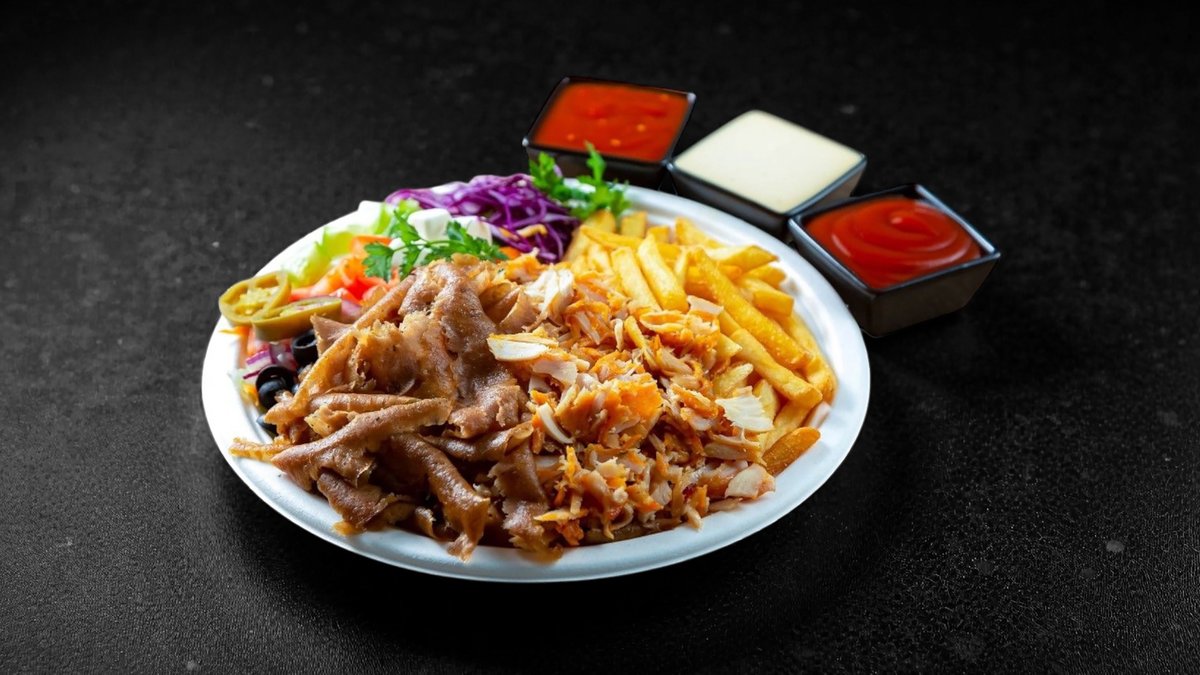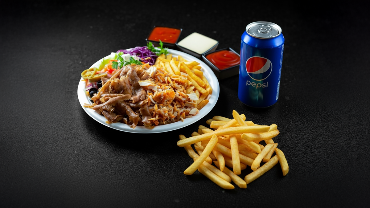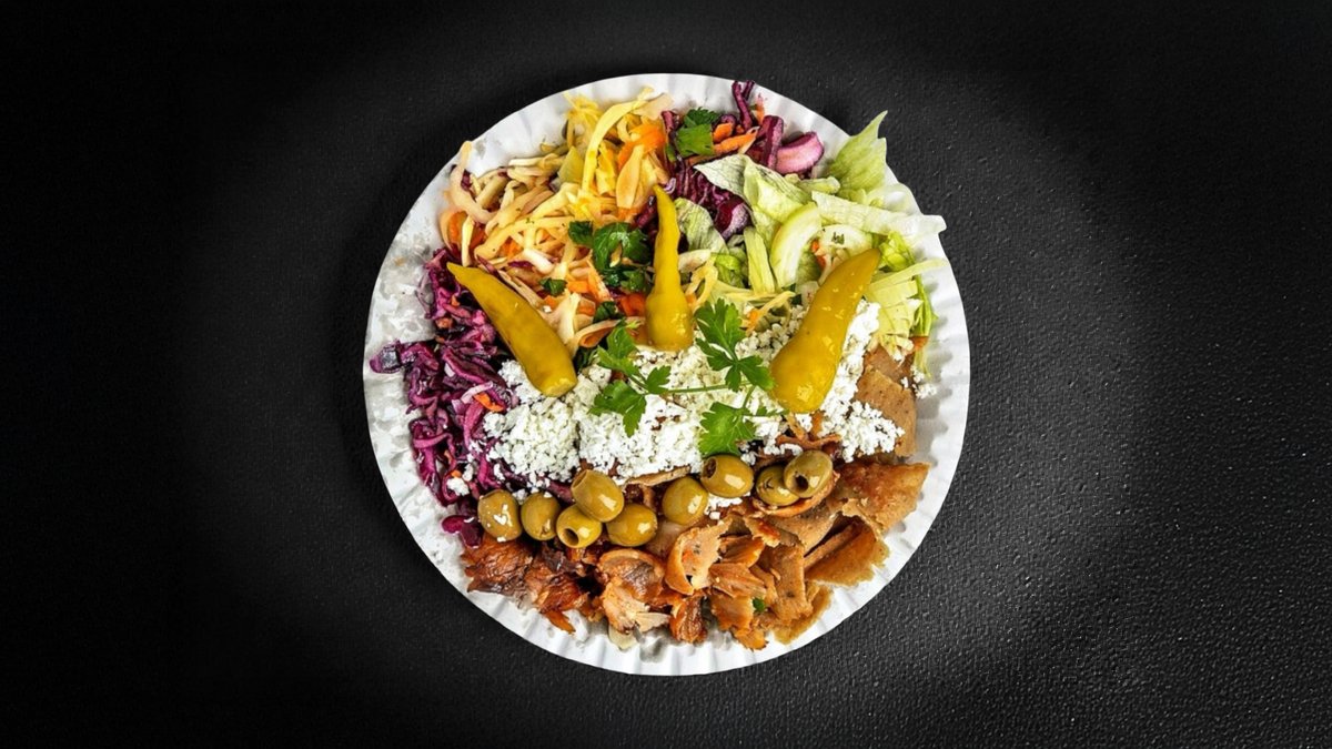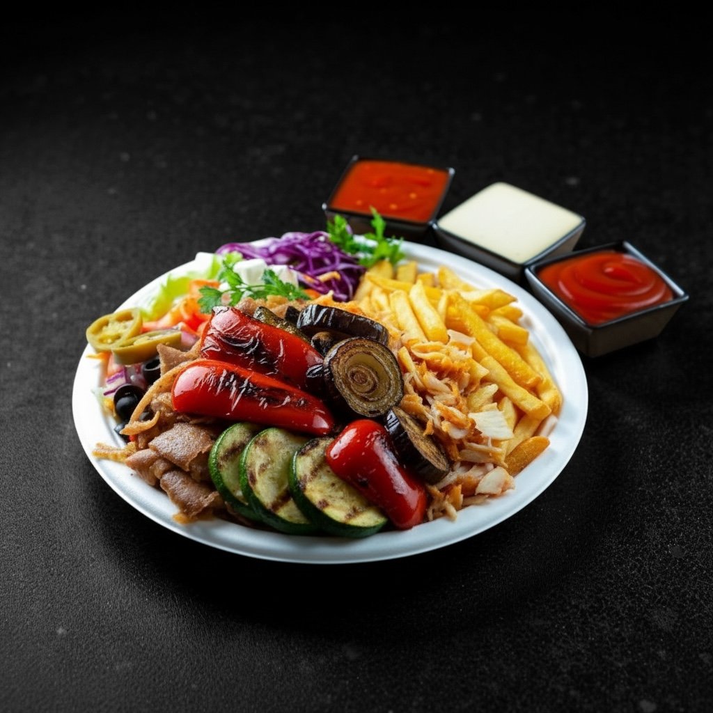 maso, salát, sýr, olivy, feferonky, hranolky, dresink, na výběr malý / velký talíř