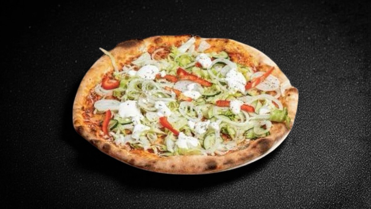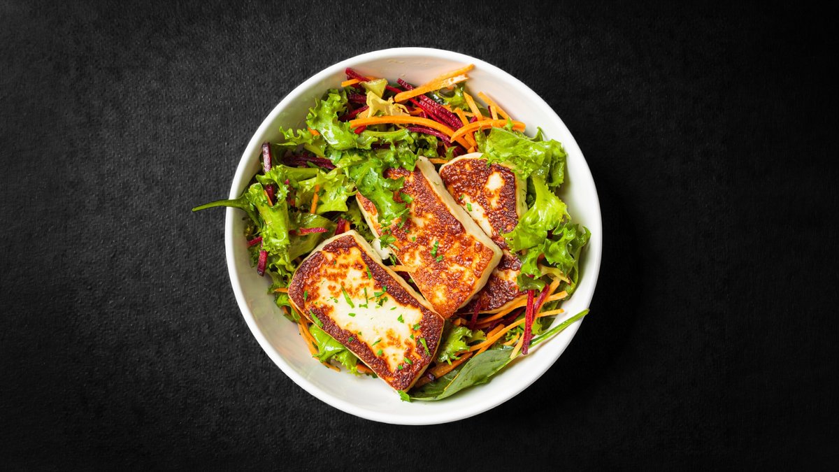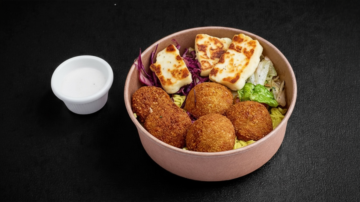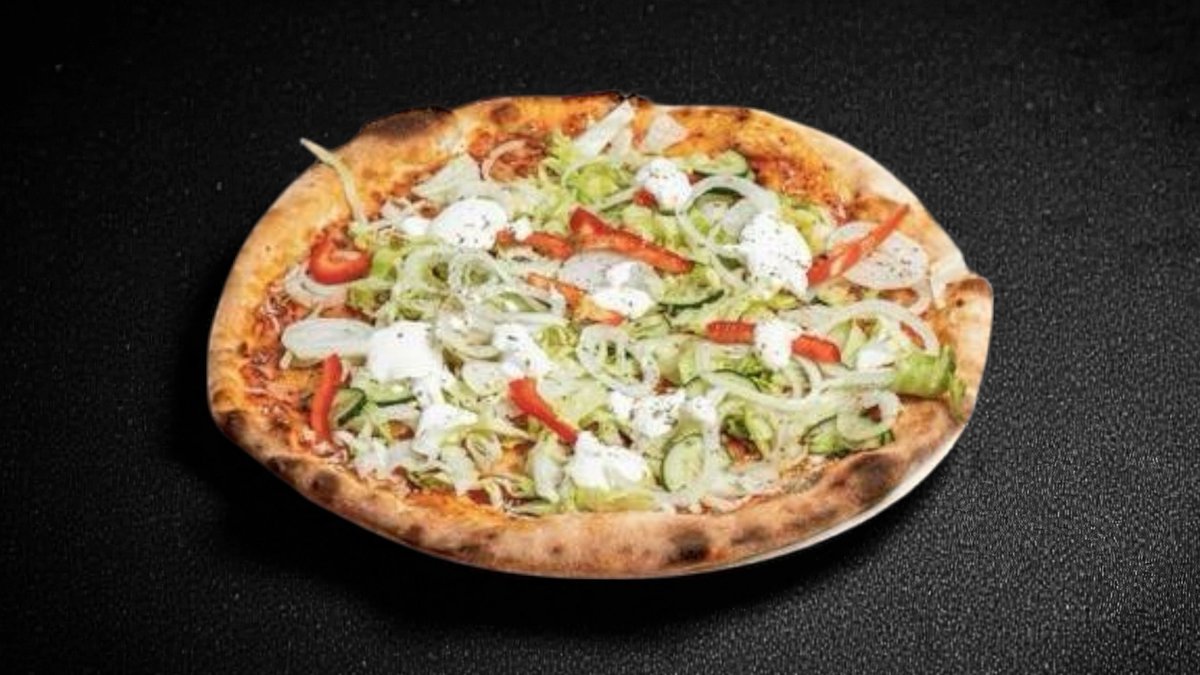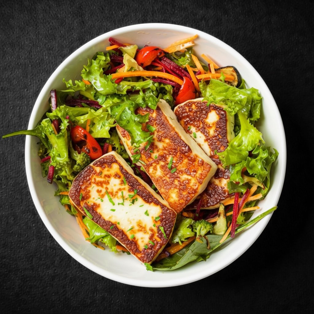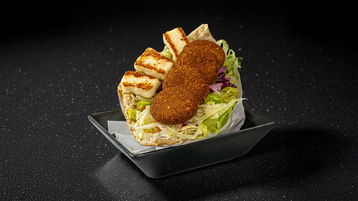 Salát, grilovaná zelenina, omáčka, jalapeňo, olivy, sýr