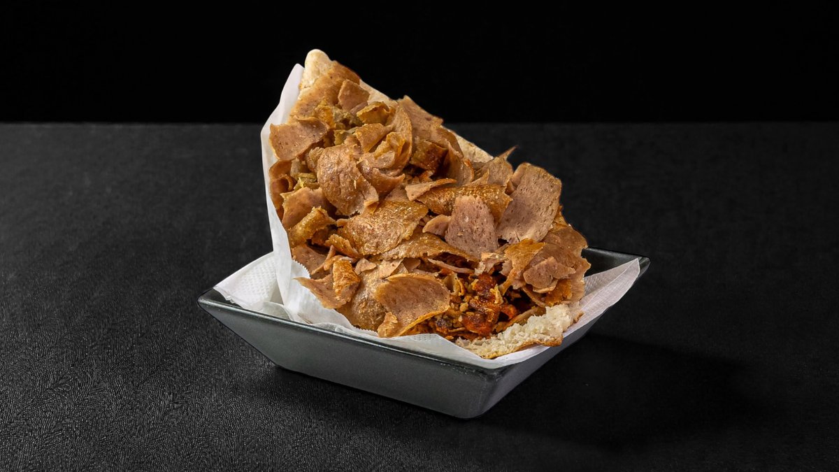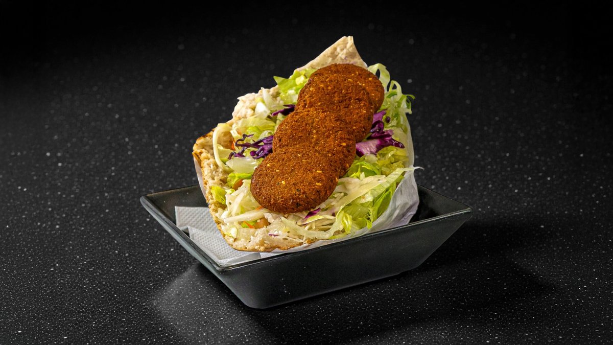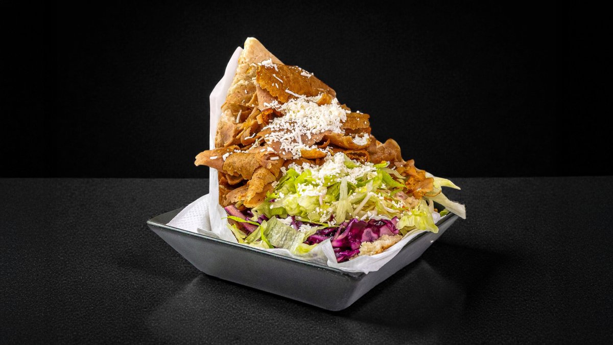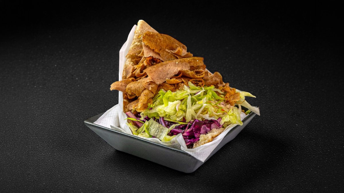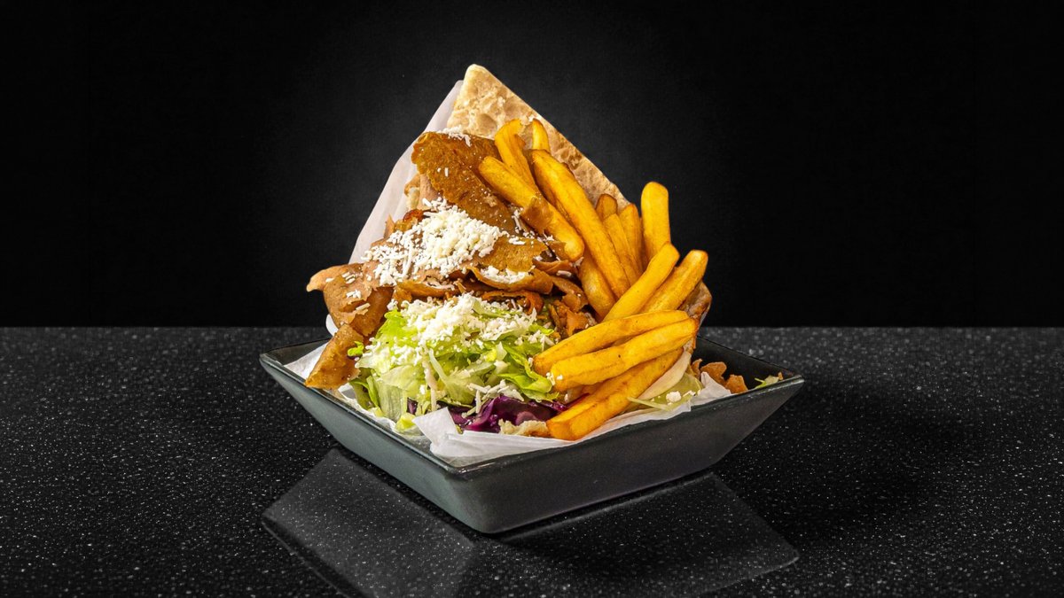 maso, salát, hranolky, dresink, na výber malý / velký kebab box
