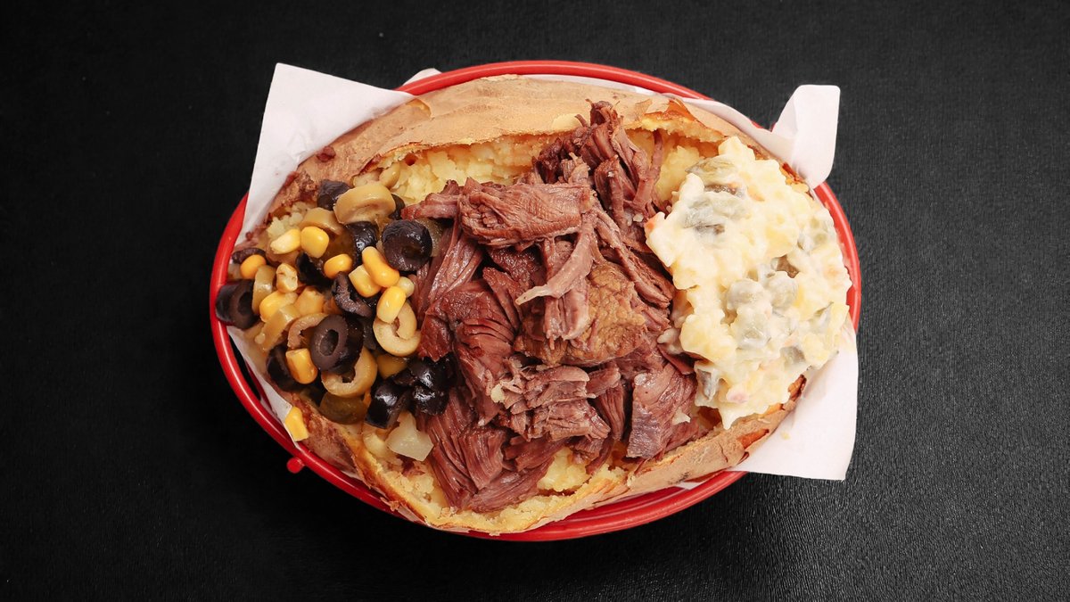 pečený brambor, sůl, máslo, mozzarella, salát, maso, olivy, kukuřice, feferonky, dresink