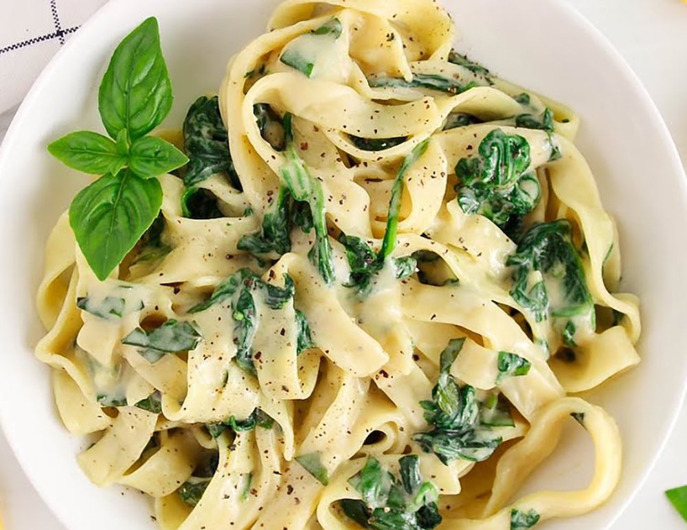 Široké nudle s kuřecím masem, špenátem a parmazánem