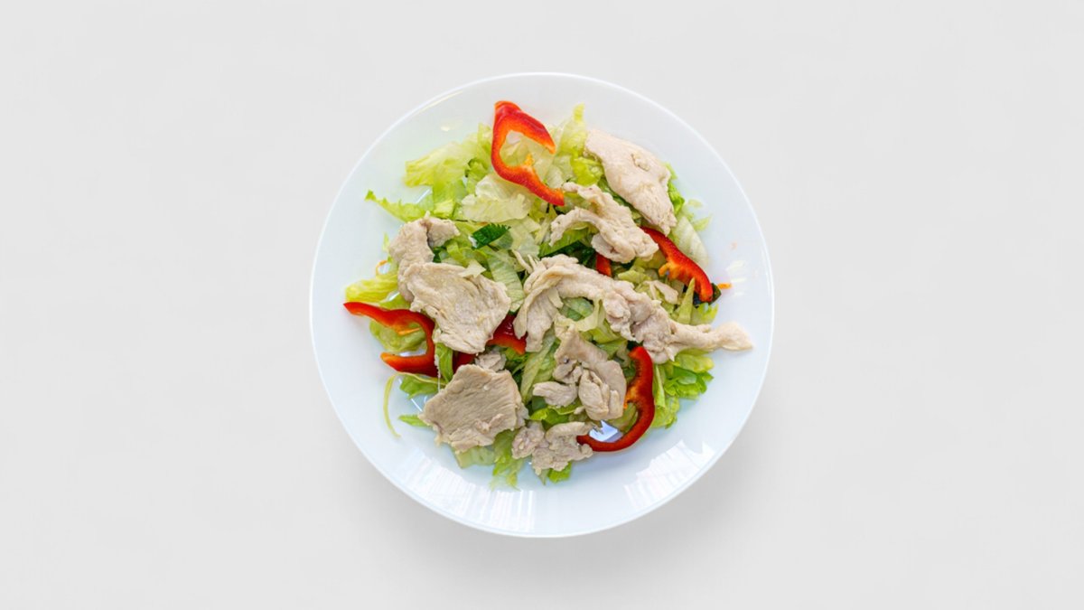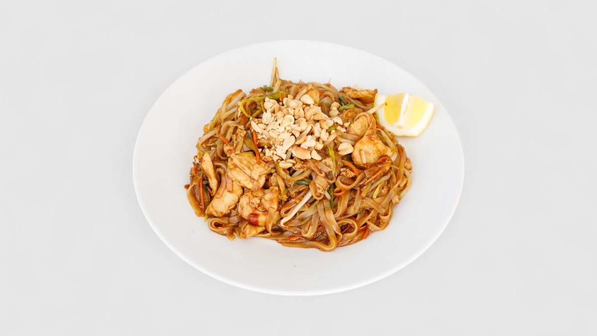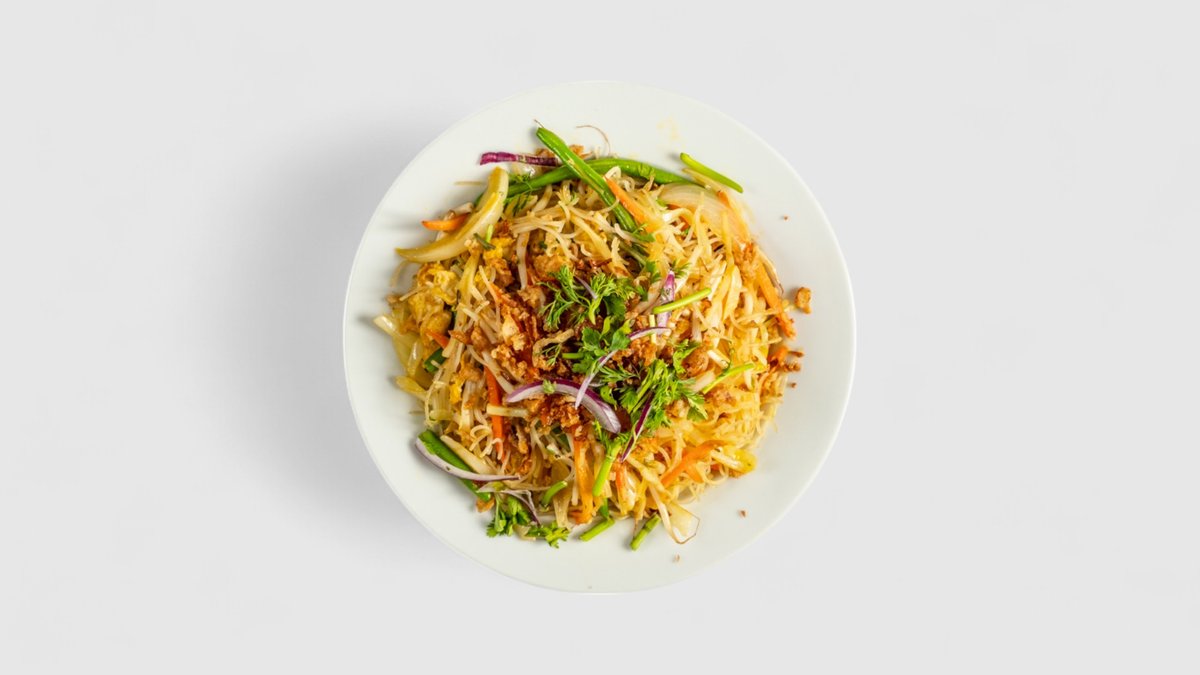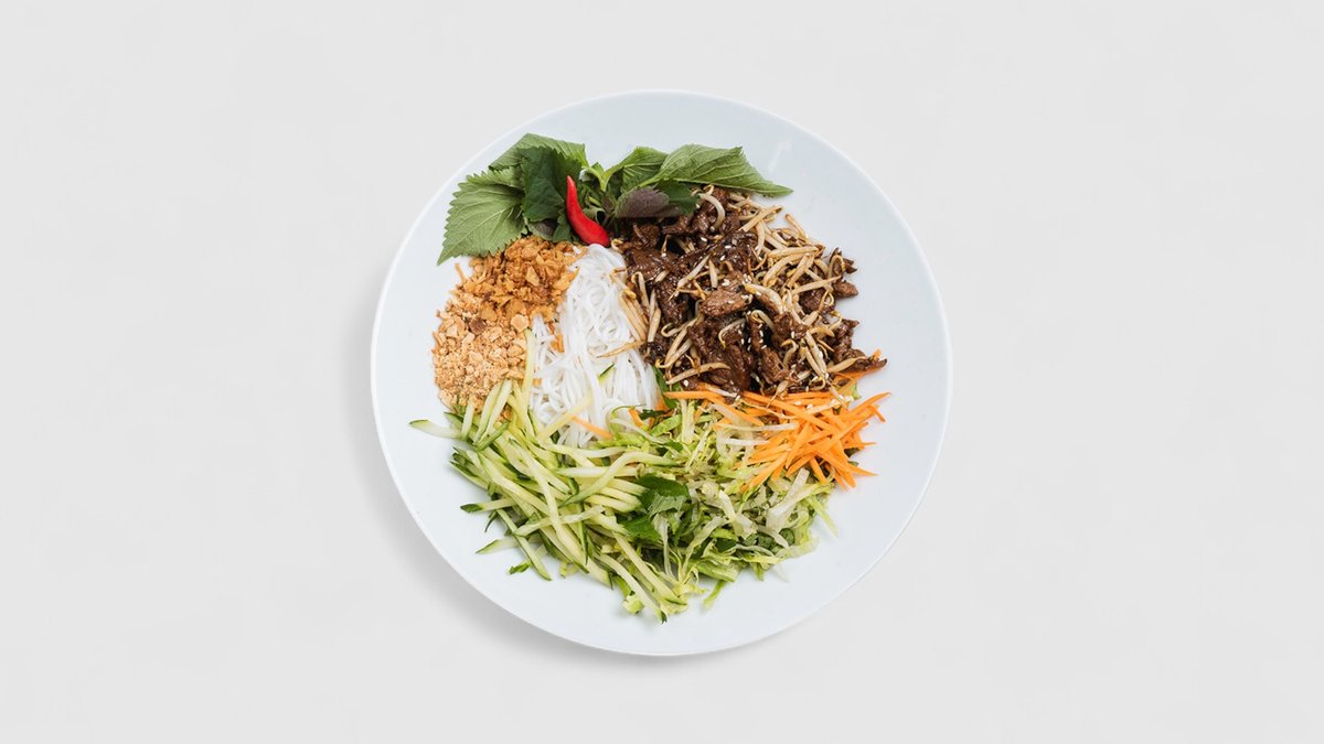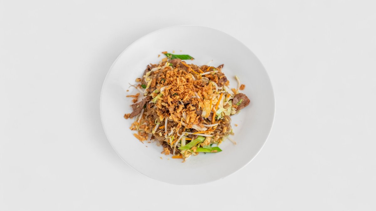 Rýžové nudle smíchané se salátem, hovězím masem, arašídy.