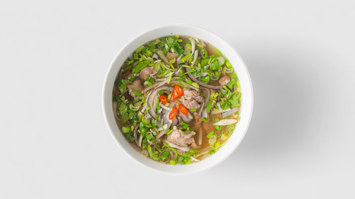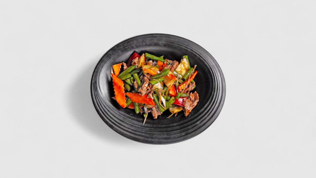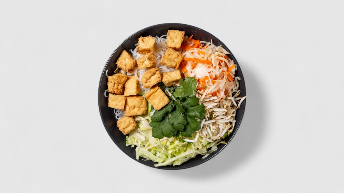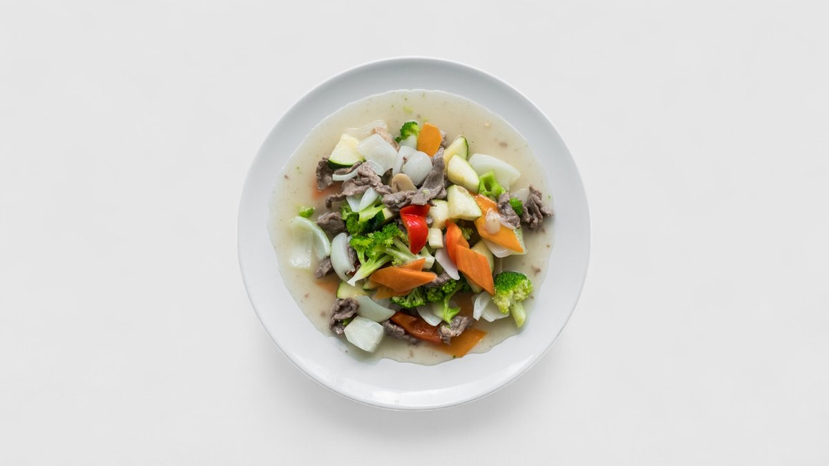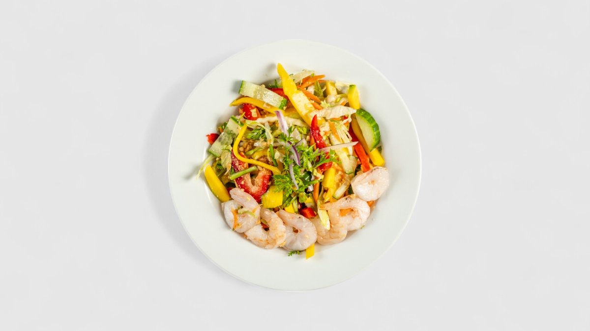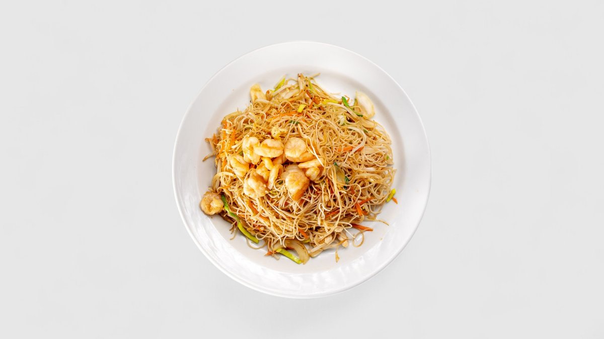 Rýžové nudle smíchané se salátem, hovězím masem, arašídy.