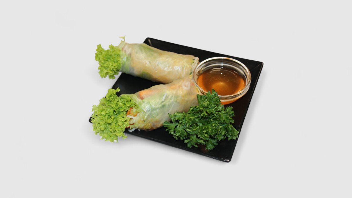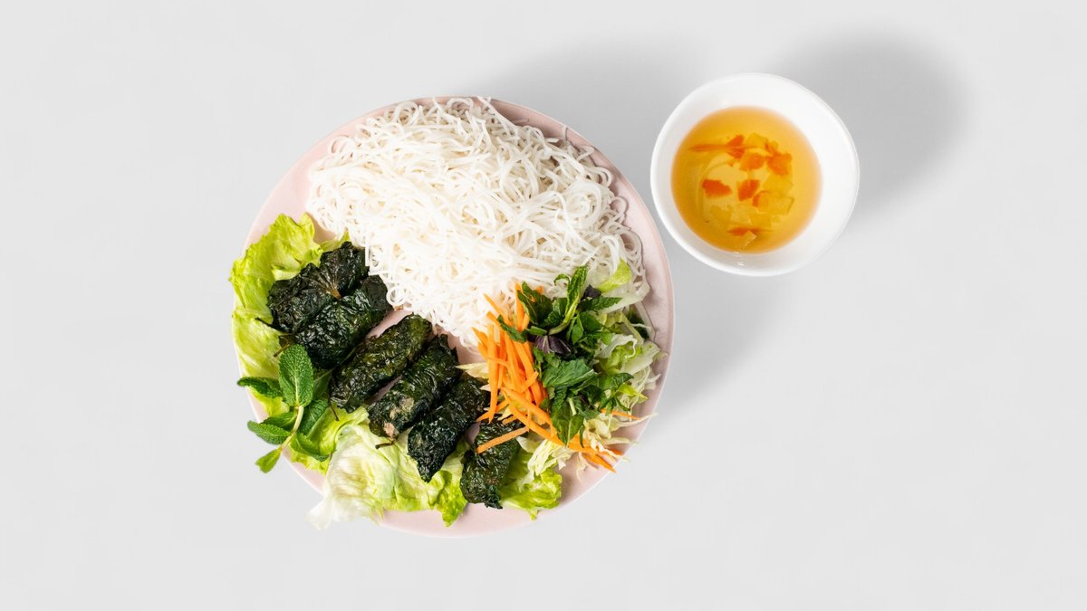 Mleté vepřové maso zabalené v betelových listech s rýžovými nudlemi.