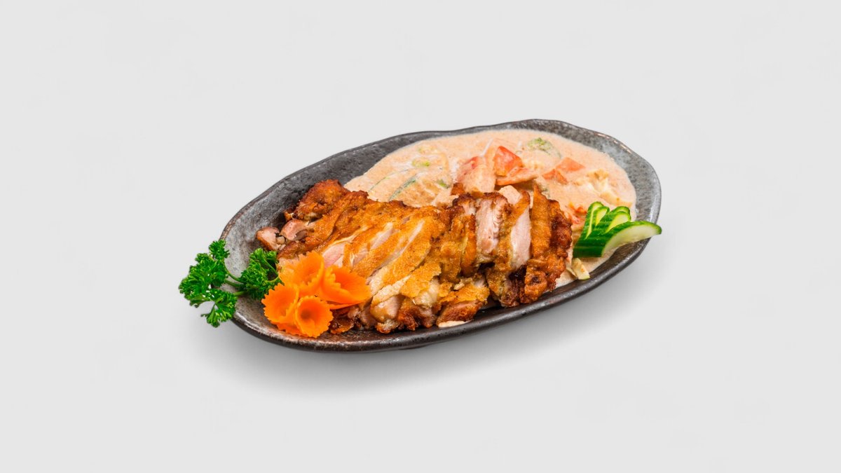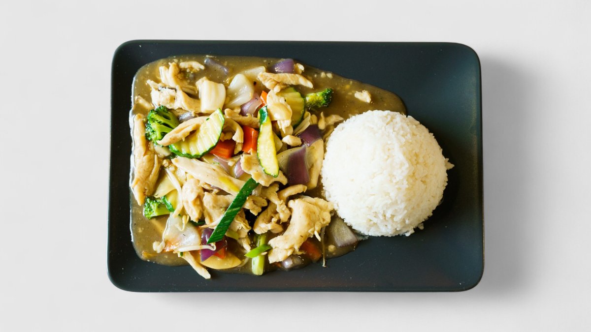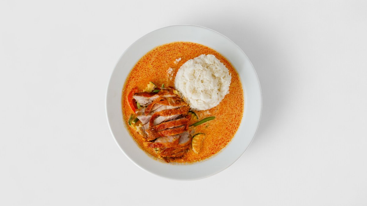 Křupavé kuře s panang thajským červeným kari a kokosovým mlékem.