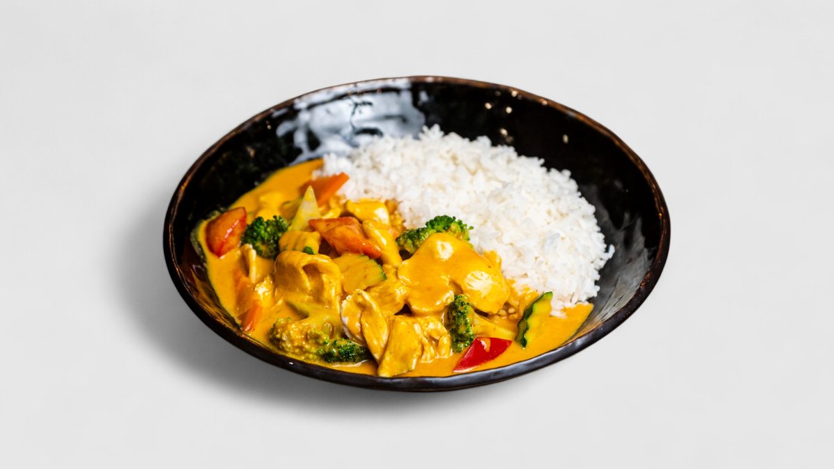 Křupavé kuře s thajským žlutým kari a kokosovým mlékem.
