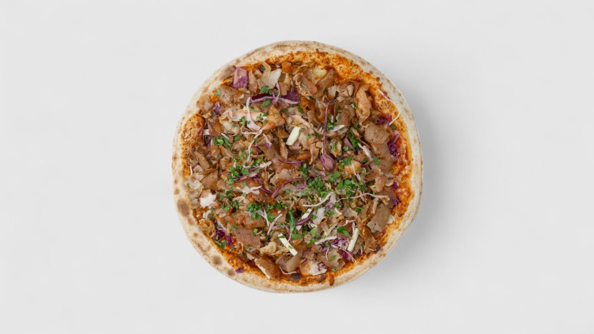 rajčatová omáčka, syr, kebab maso, cibule, feferonky