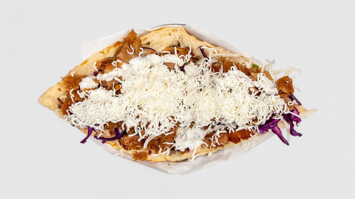 tortilla plněná masem, salátem s dressingem a ovčím sýrem