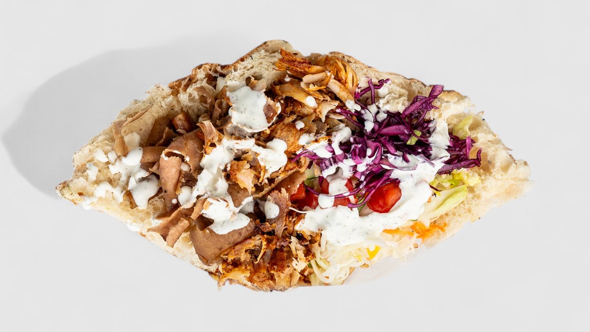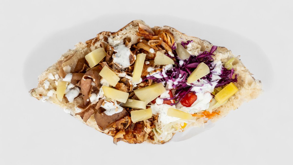 maso, salát, dressing, ovčí sýr, olivy, feferonky, turecký chléb