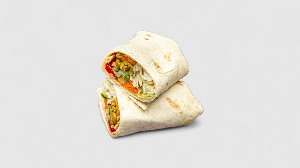 tortilla plněná masem, salátem, dressingem a ovčím sýrem