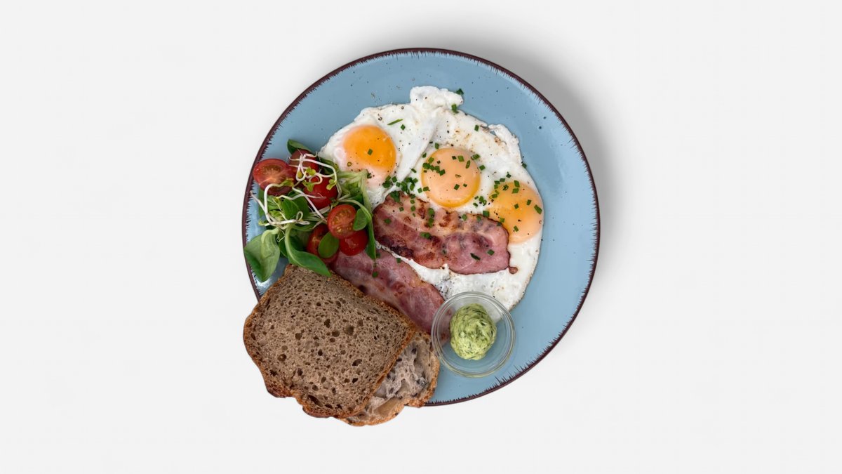 3 sázené vejce, šunka, máslo, žitný chléb, polníček rajčata
