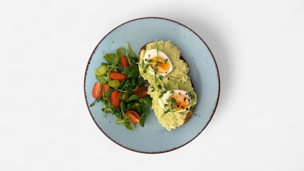 opečený chléb, avokádo žervé olivový olej, sázené vejce, microgreens, rajče, rukola