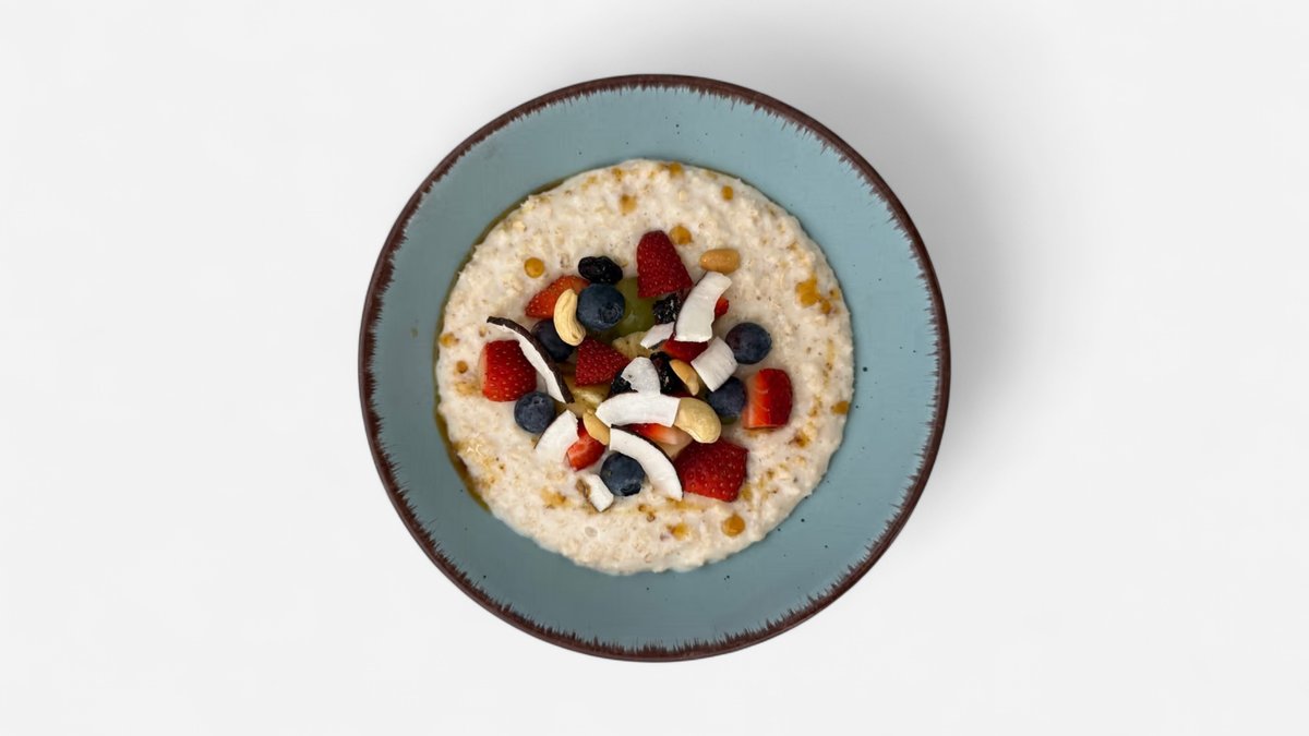 ovesná kaše, ořechy, javorový sirup, ovoce