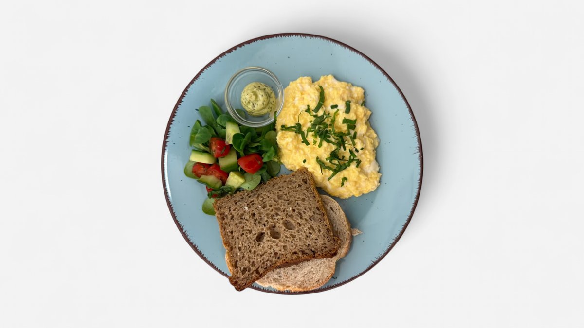 3 míchaná vejce, pažítka, máslo, žitný chléb