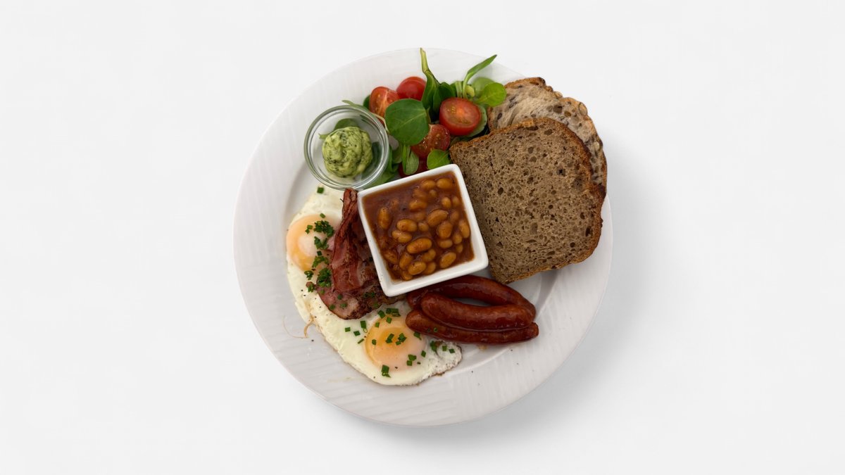 2 sázené vejce, párky, slanina, fazole, žitný chléb máslo, žampiony