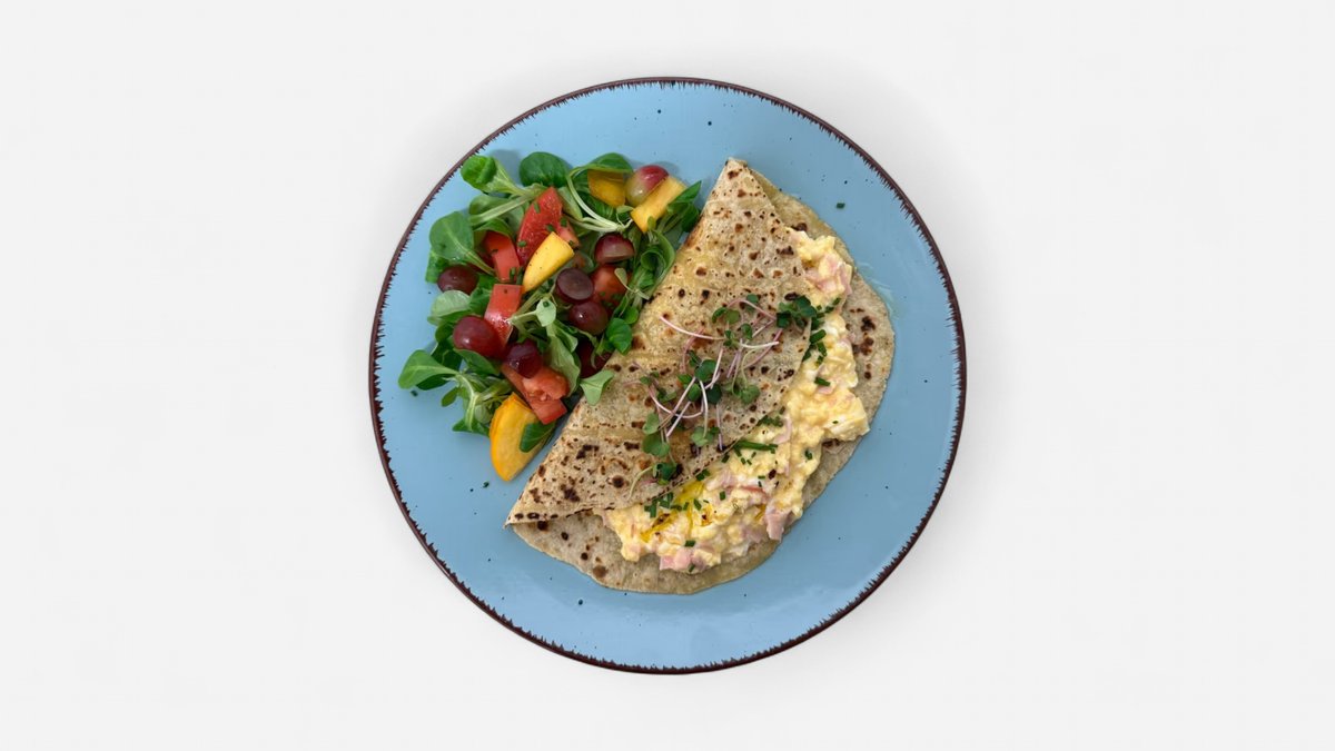 Bramborová lokše s vejci, šunkou, parmezánem, pažitka, bylinkový olej, zeleninový salát