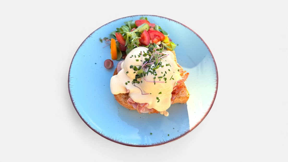 Toust, šunka, vejce, holandská omáčka, pažitka, zeleninový salát