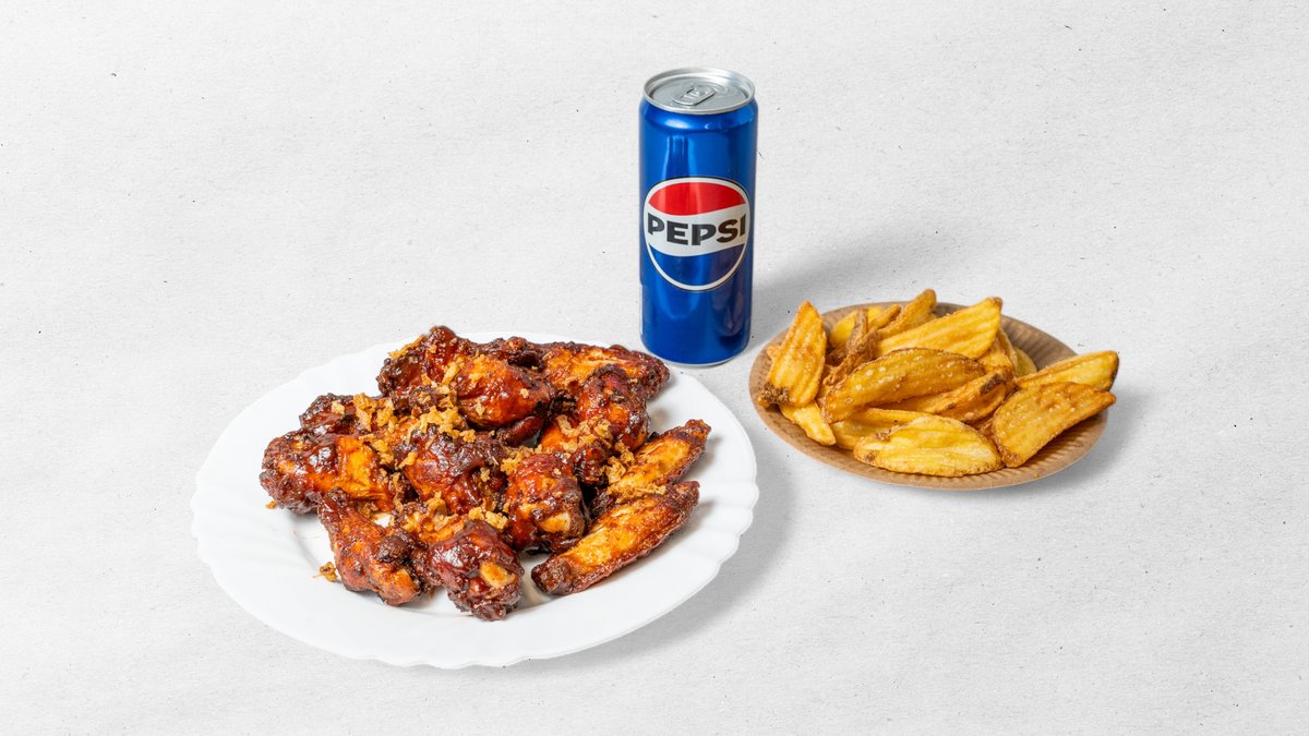 5 ks smažených marinovaných BBQ kuřecích křidélek, hranolky, nápoj 0,33 l
