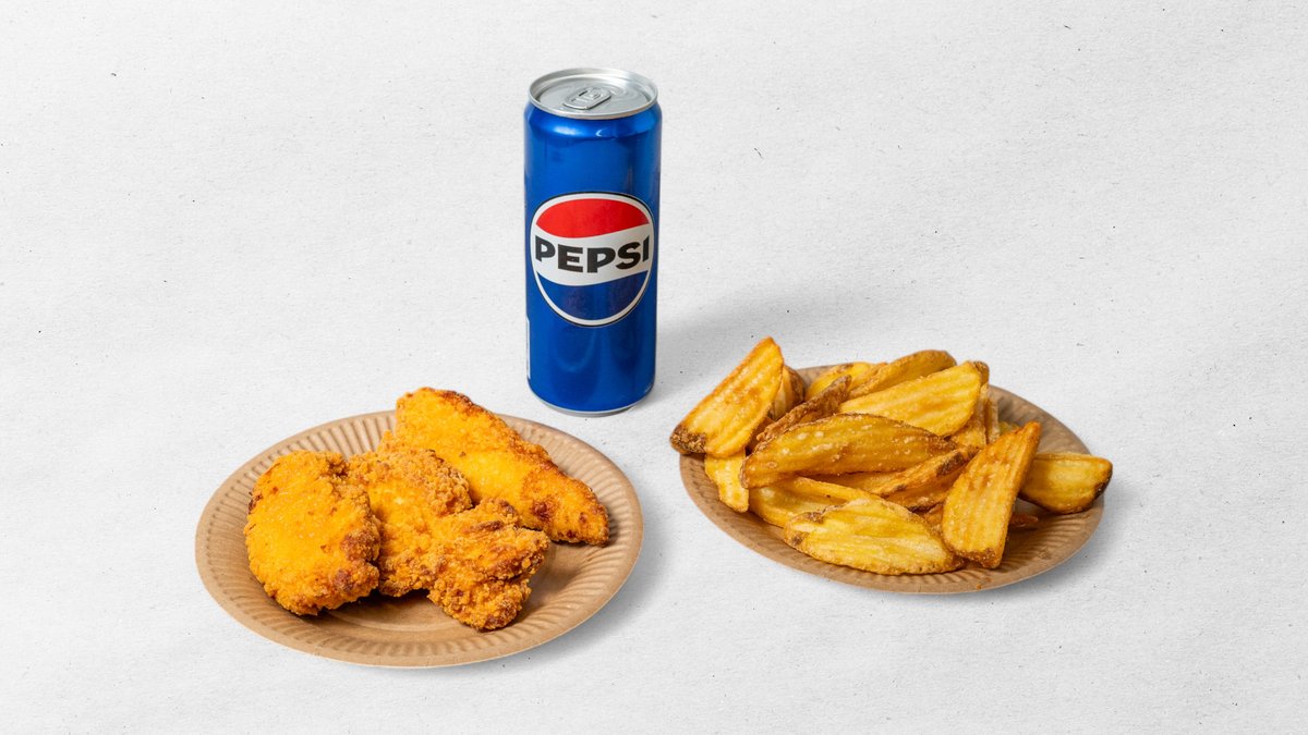 3 ks nepálivé, obalované, smažené kuřecí stripsy, hranolky, nápoj