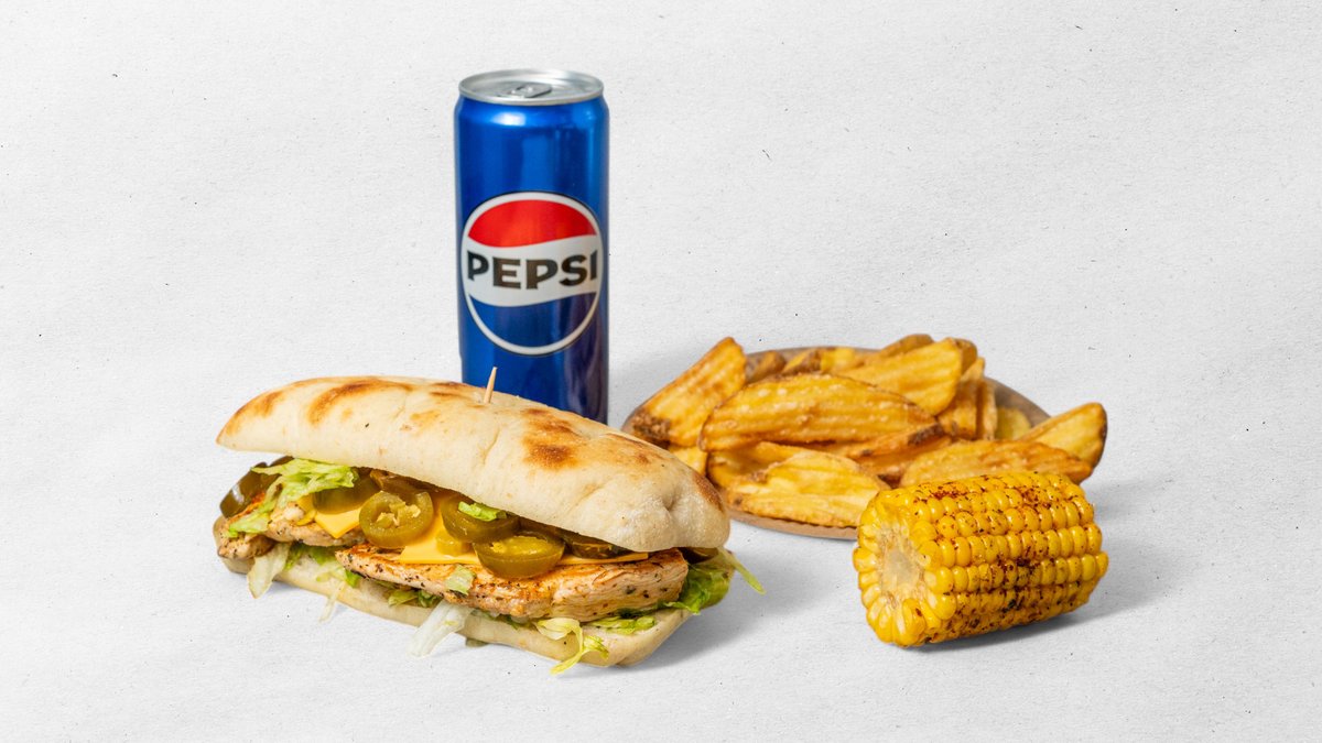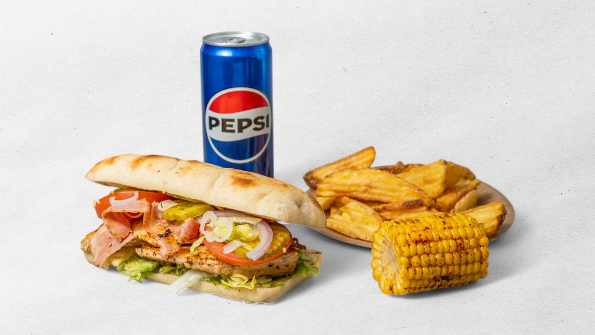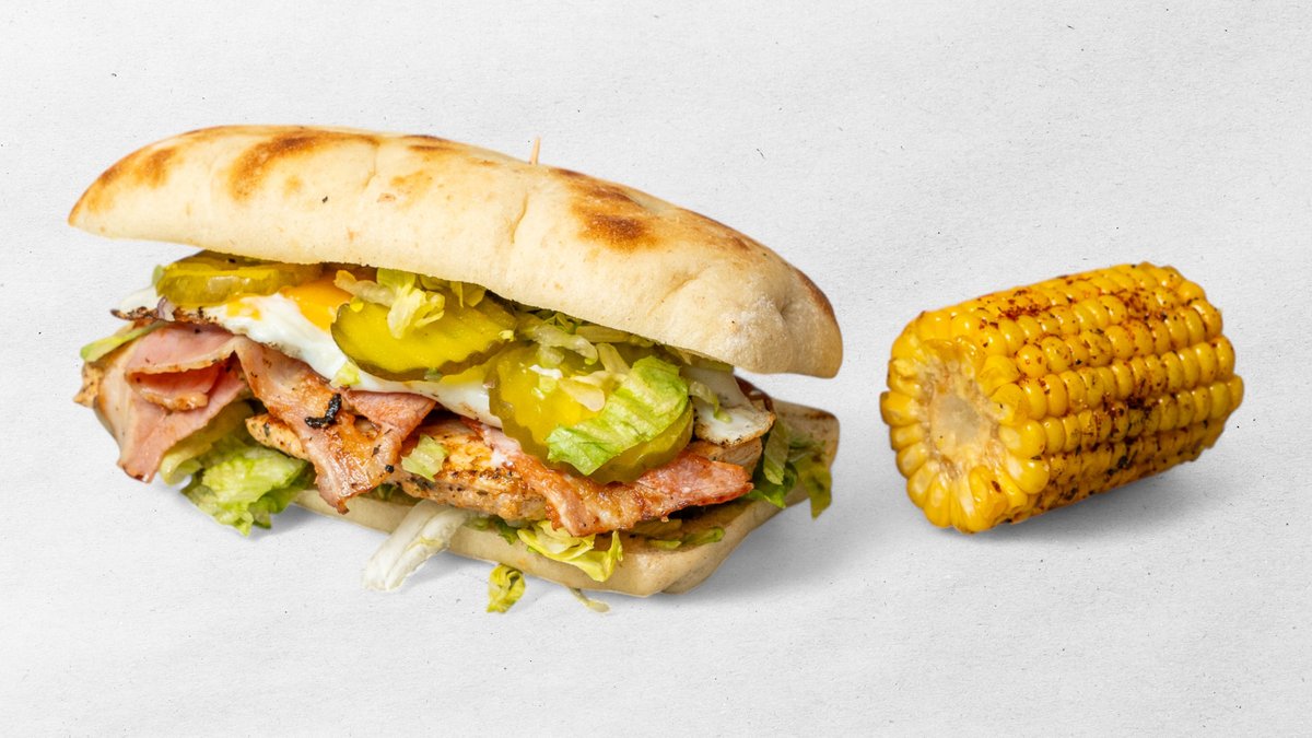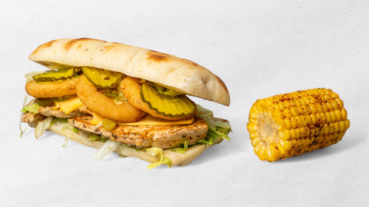 Výběr z jakéhokoliv kuřecího steaku v bagetě + 4 ks marinovaných křidélek + 5 ks cibulových kroužků + hranolky + dresink kukuřice nugaty 6 ks