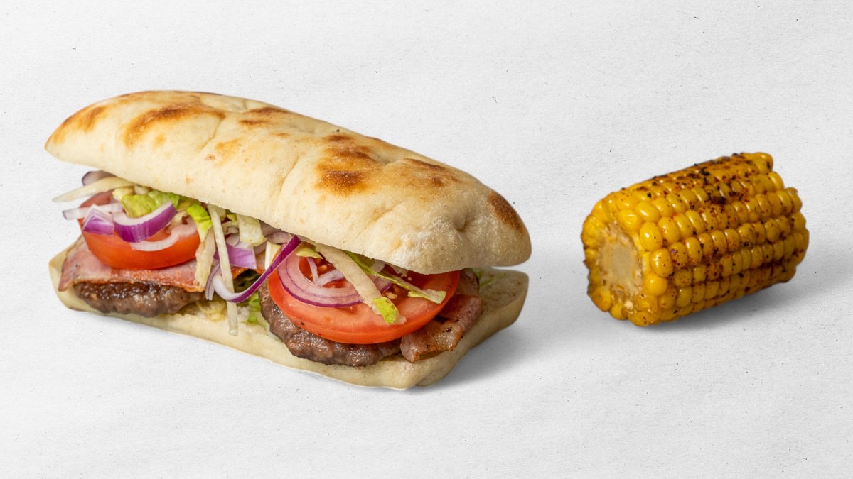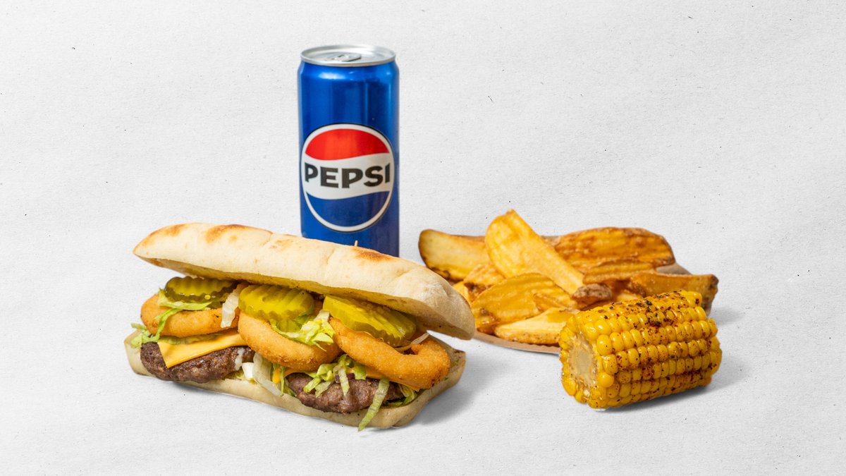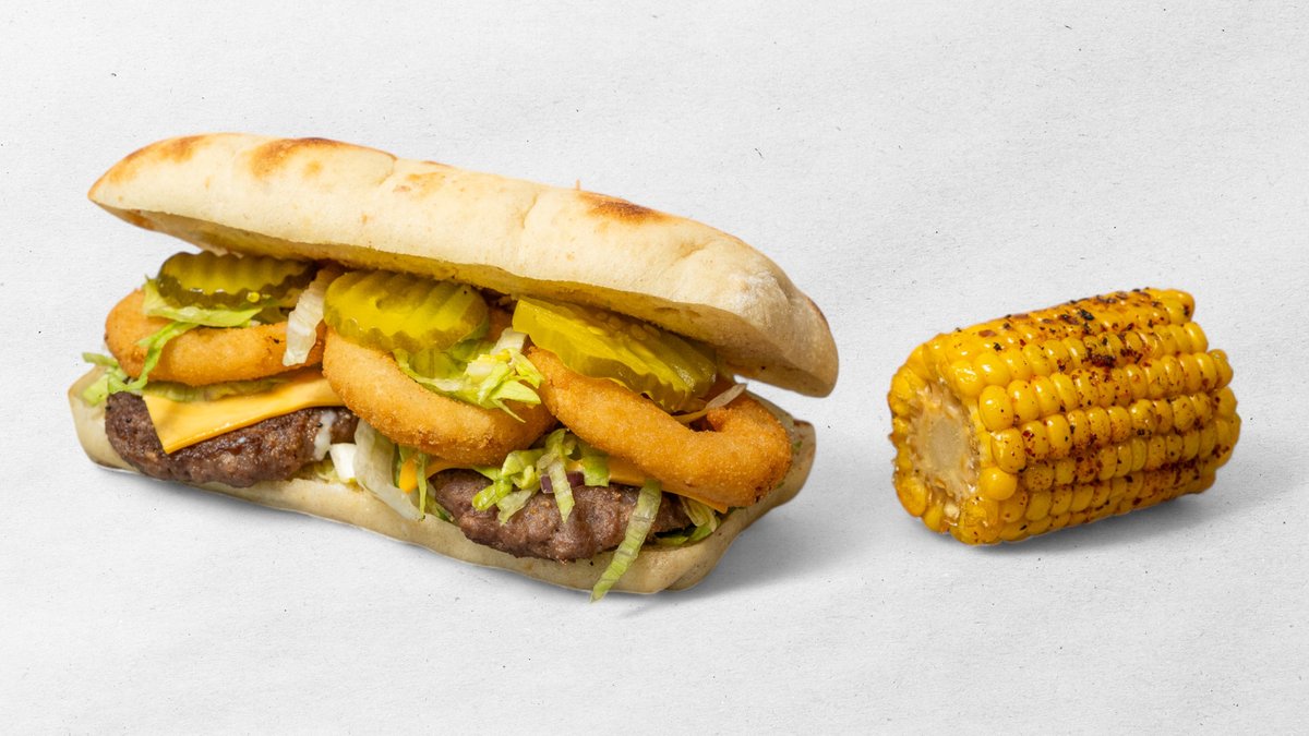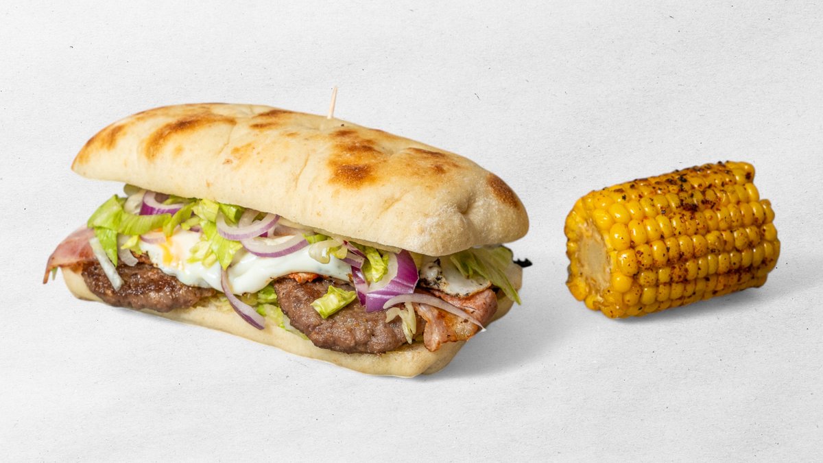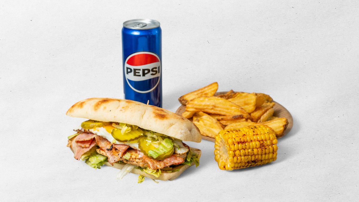 Výběr z jakéhokoliv burgeru v bagetě + 4 ks marinovaných křidélek + 5 ks cibulových kroužků + hranolky + dresink+ kukuřice nugaty 6 ks