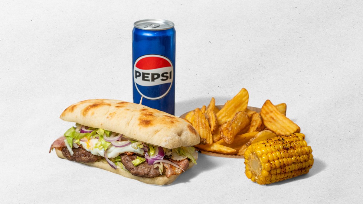 Schiaccia bageta 2x 60g hovězí maso, pepřová omáčka, kysely okurky, čerstva rajčata, křupavý salát, červená cibule, křupavé plátky slaniny, + hranolky, + nápoje 0,33l + dresing
