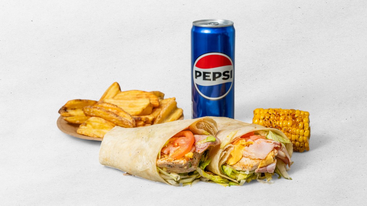 Tortilla (grilovaný kuřecí prsní steak, ledový salát, rajčata, majonéza, cheddar sýr)+ hranolky, + nápoje 0,33l + dresink