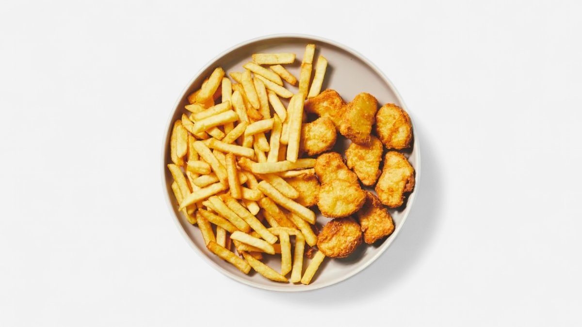 Velké kuřecí nugetky s hranolky