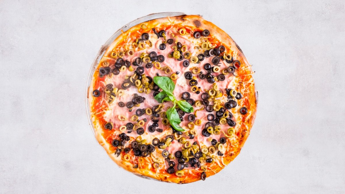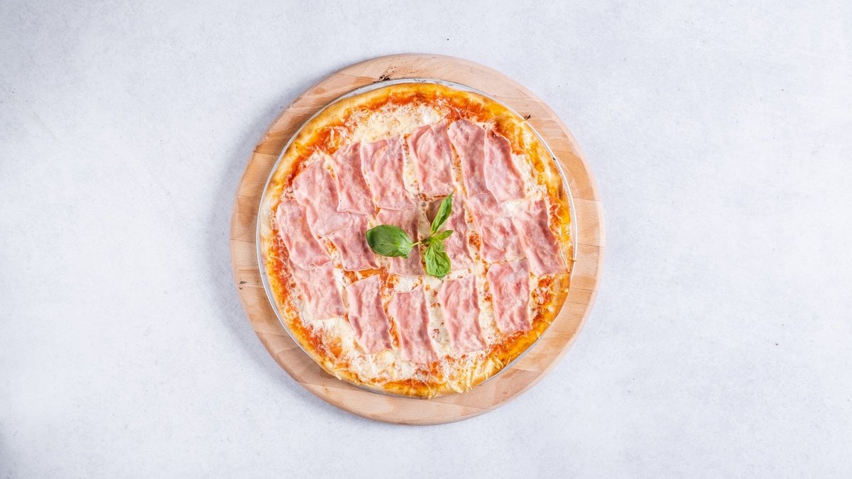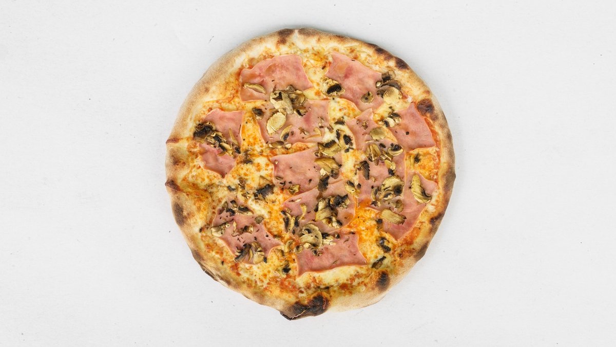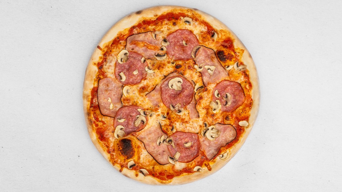 Rajčatové sugo, Mozzarela, Šunka, Žampiony čerstvé, Olivy mix, Eidam