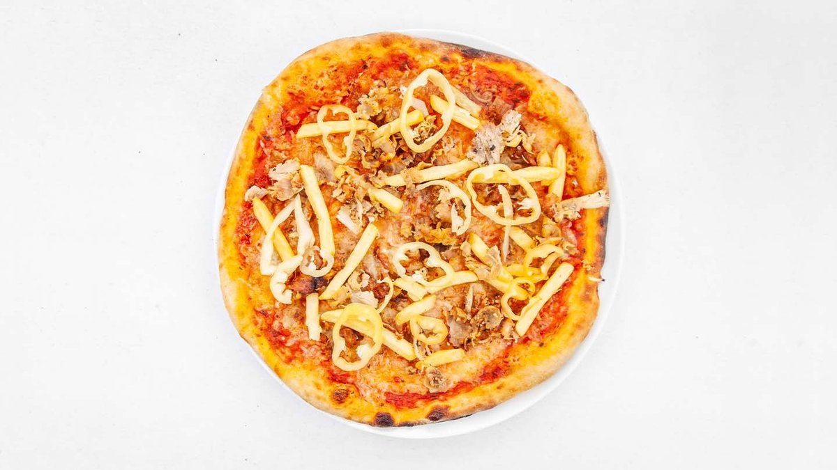 Rajčatové sugo, Mozzarela, Šunka, Kebab maso, Hranolky, Čedar, Česnek dresink