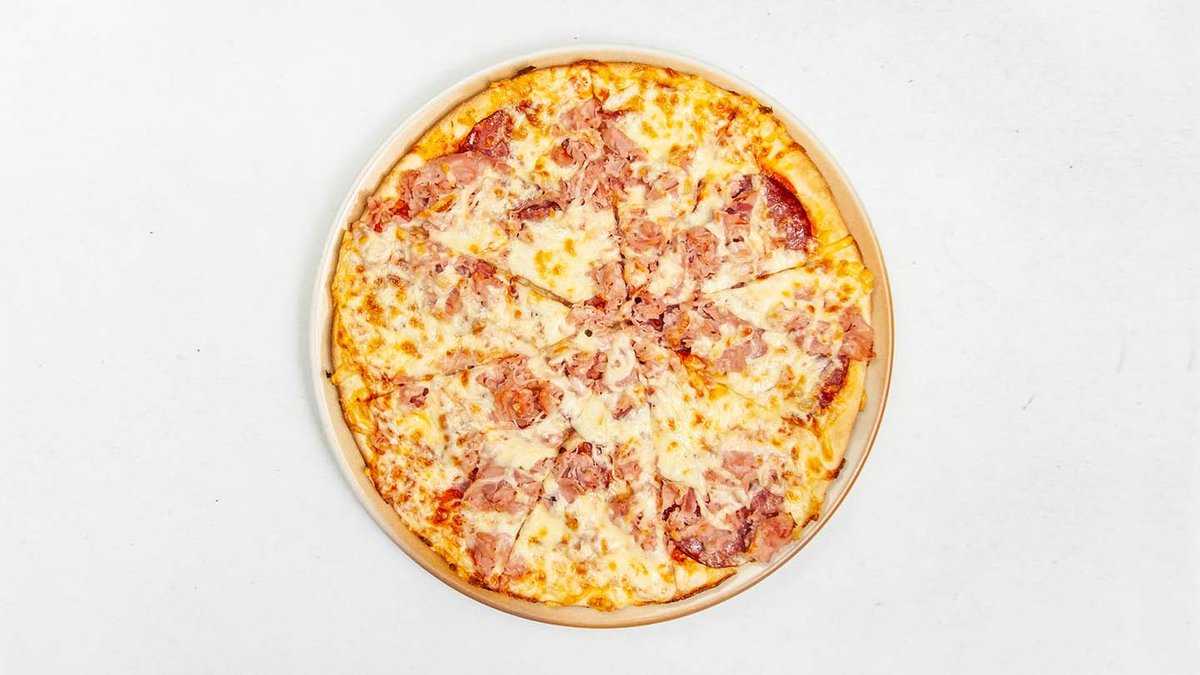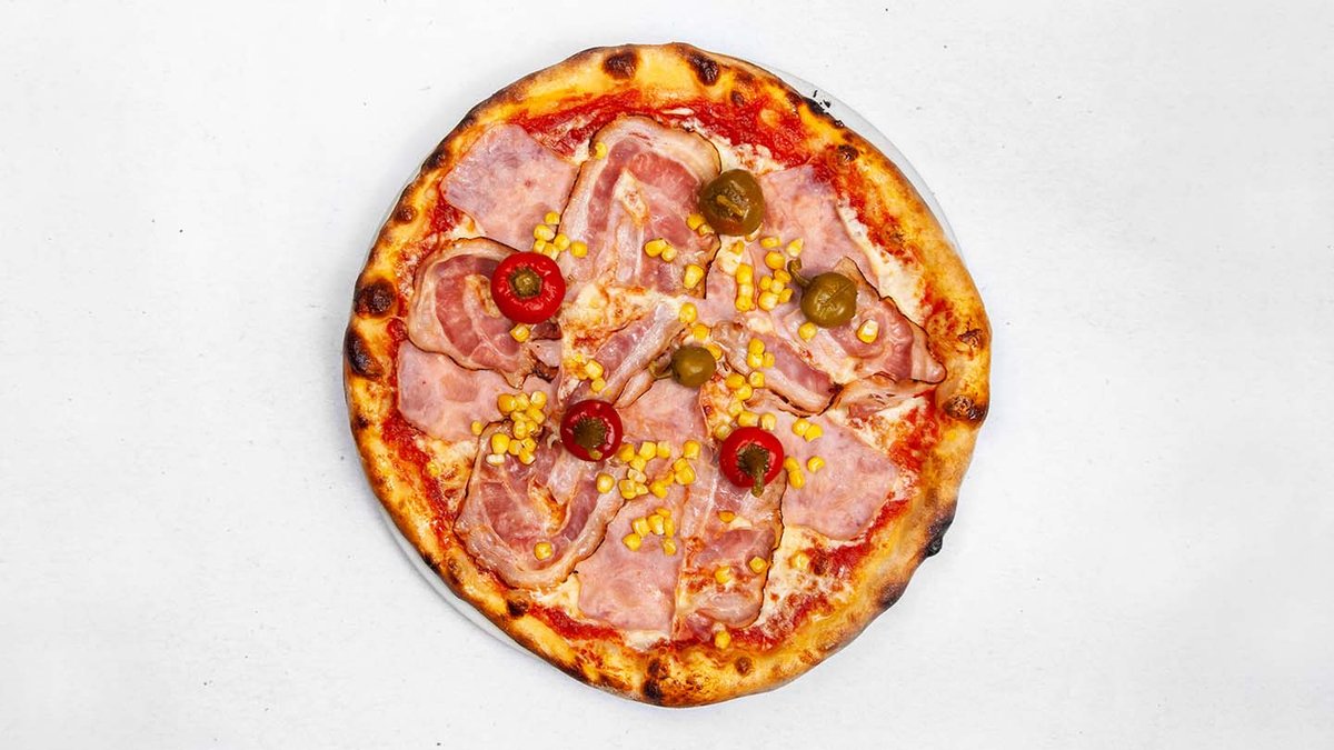 Rajčatové sugo, Mozzarela, Šunka, Slanina, Žampiony čerstvé, Kukuřice, Paprika, Vejce, Eidam