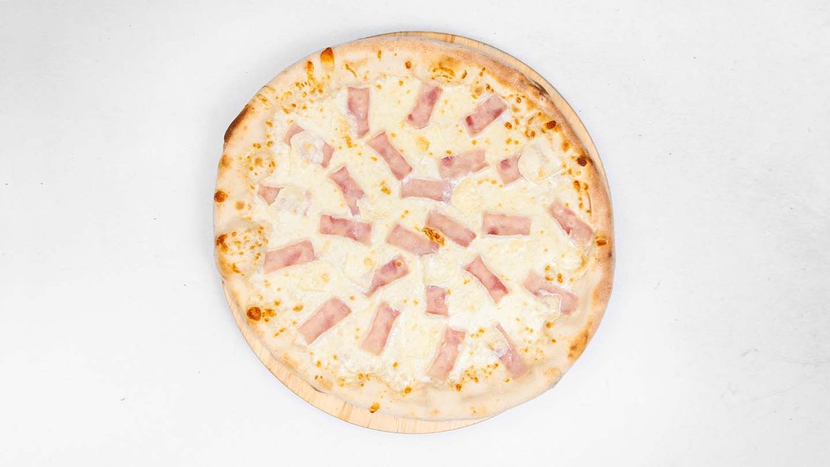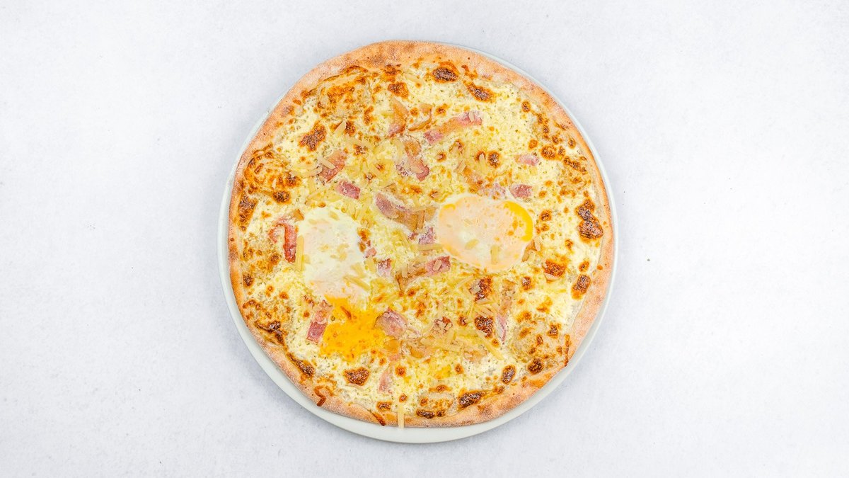 Krémové sugo, Mozzarela, Šunka, Slanina, Cibule, Vejce, Eidam