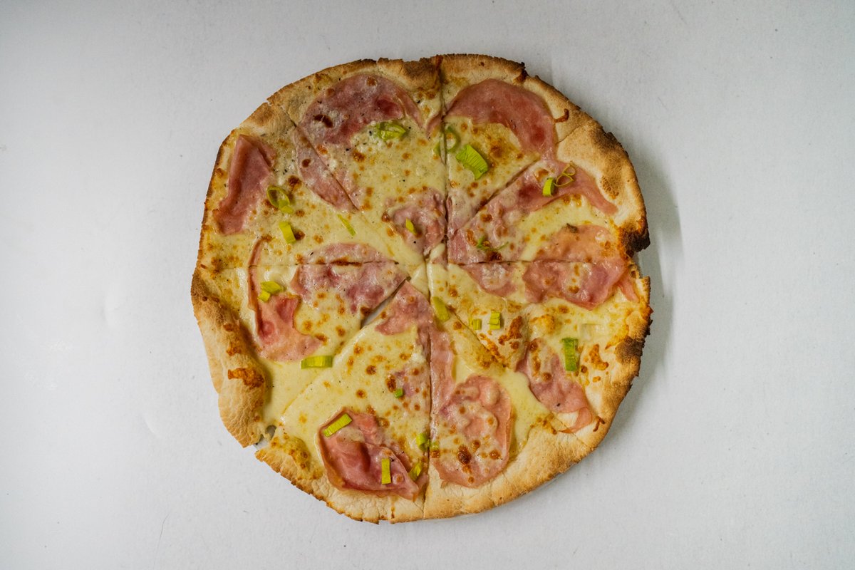 Rajčatové sugo, Mozzarela, Šunka, Paprikový salám, Vepřové maso, Hořčice, Cibule, Eidam