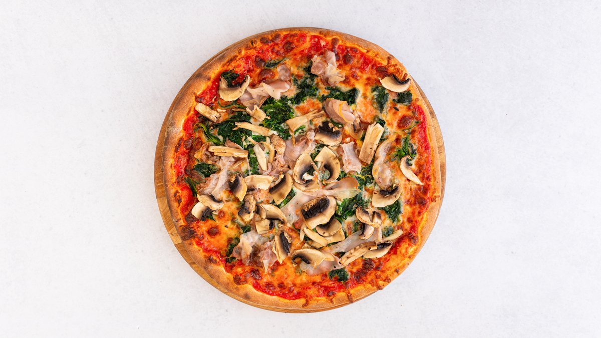Rajčatové sugo, Mozzarela, Šunka, Slanina, Špenát, Eidam