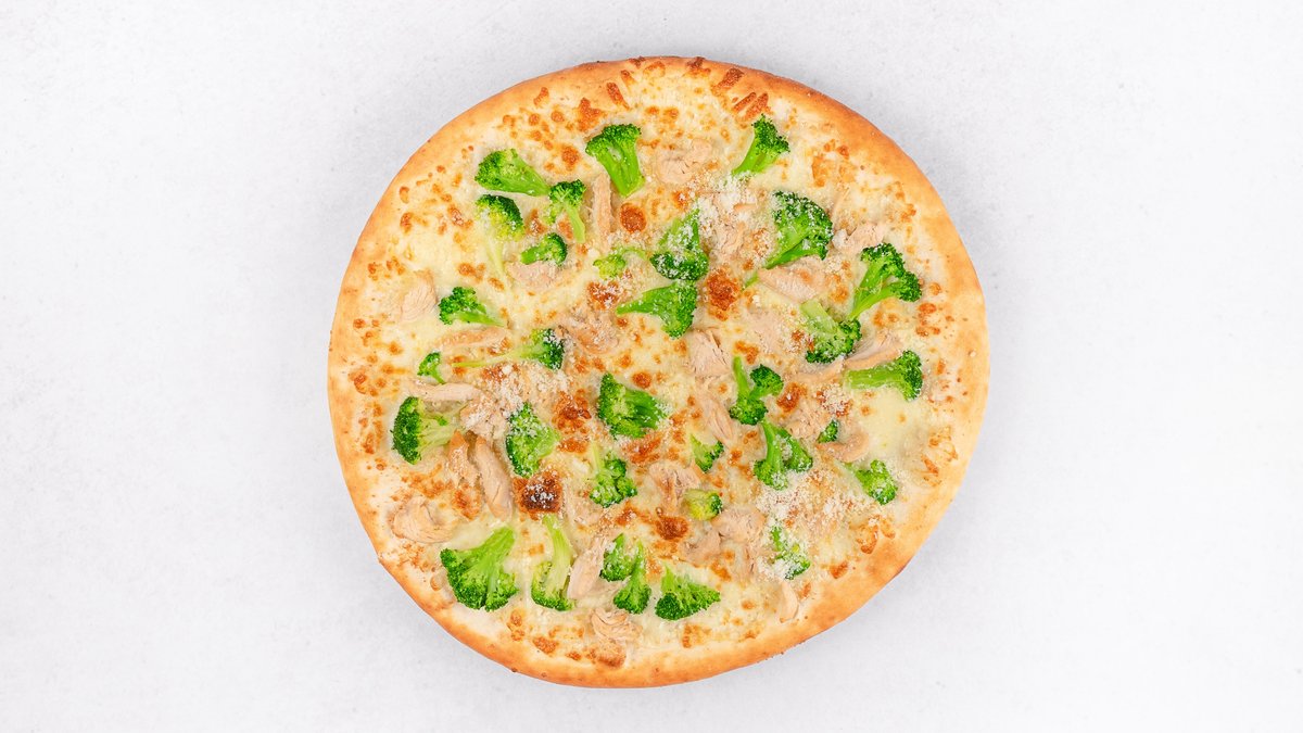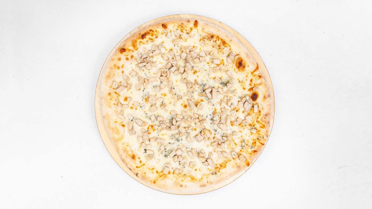Krémové sugo, Mozzarela, Šunka, Kuřecí maso, Kukuřice, Olivy mix, Eidam