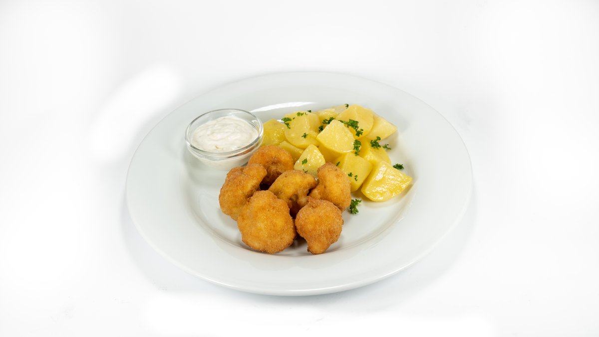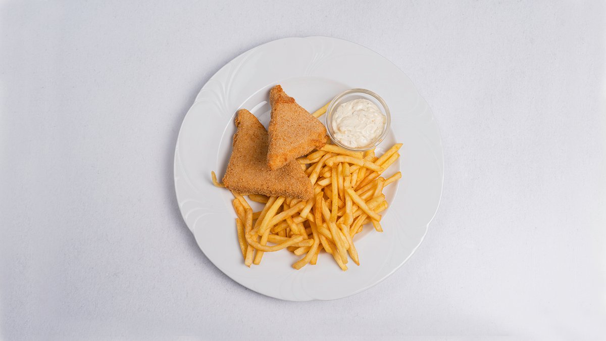 200g obalovaný madeland, hranolky, tatarská omáčka