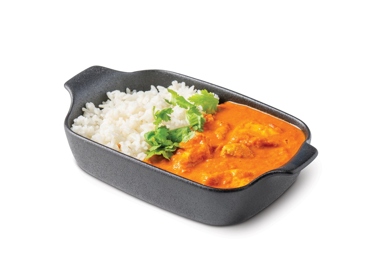 Kuřecí kousky v klasické indické omáčce s masem naloženým a upečeným v bílém jogurtu a doplněné o jasmínovou rýži jako přílohu. Jídlo je zdobené lístky čerstvého koriandru a má lehce pikantní chuť. Skvělá volba k obědu i večeři.
