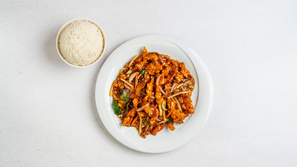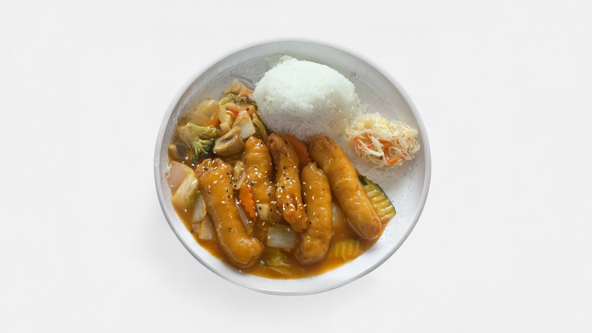 S kuřecími kousky nebo Tofu + Rýže , omáčka , zelenina , med, kokosové mléko , pikantní nebo sladkokyselou omáčkou .