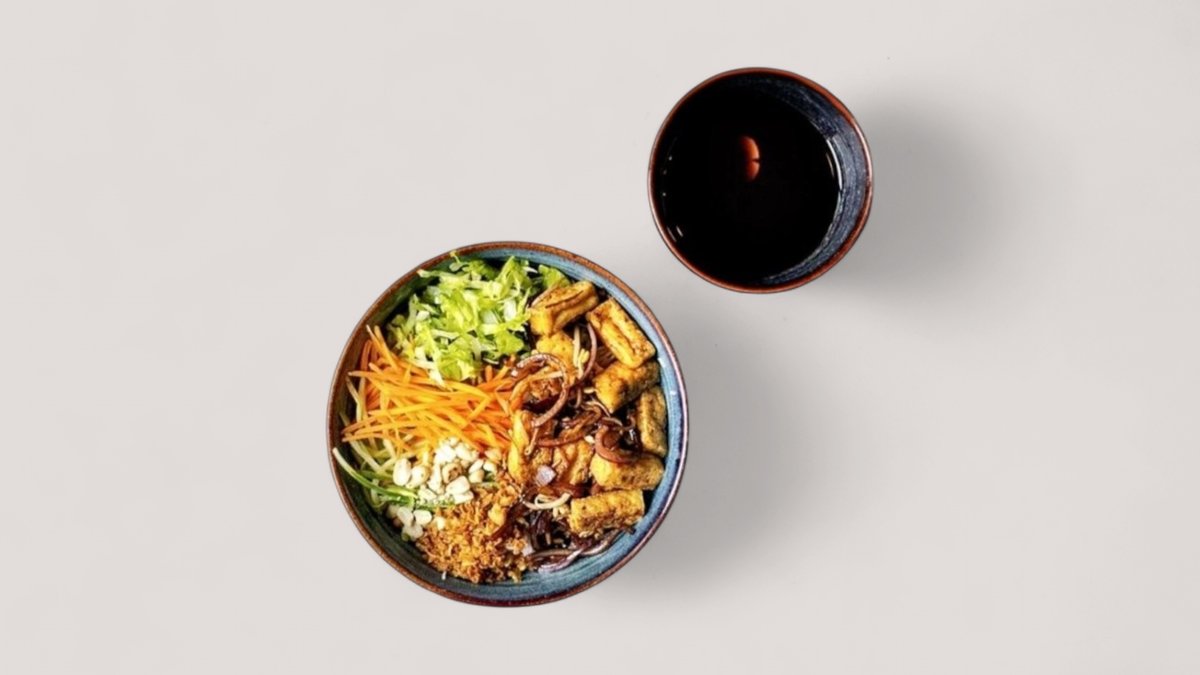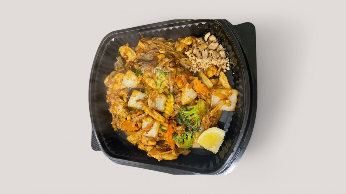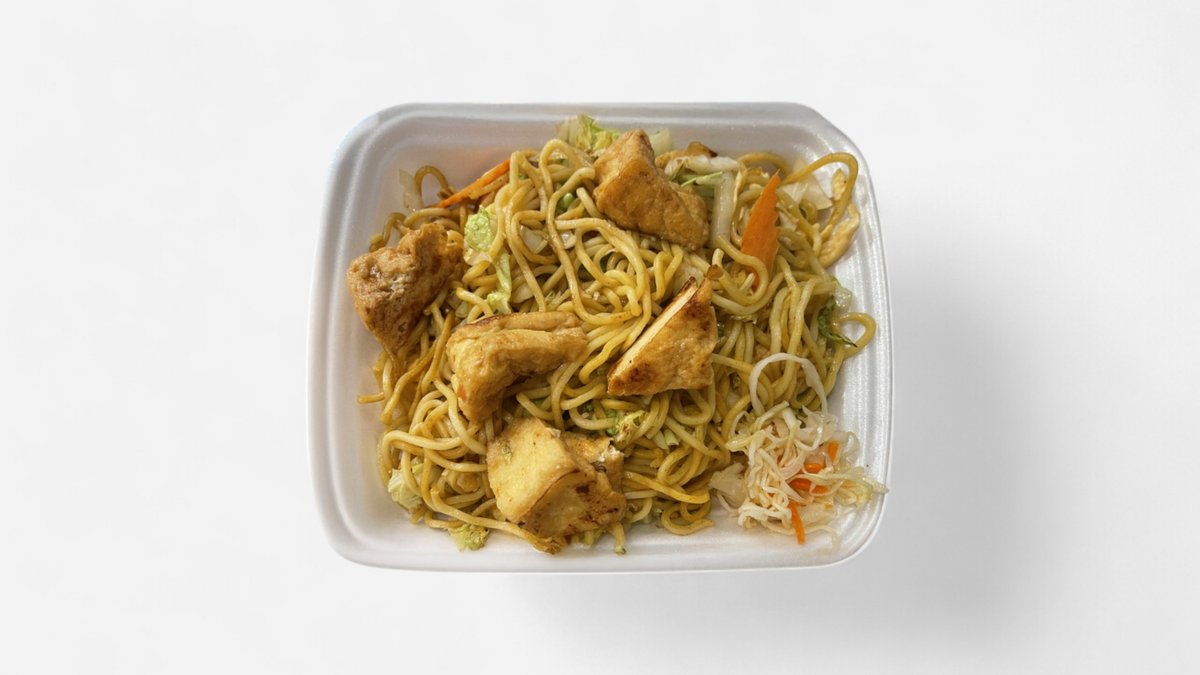 Rýžové nudle s restovaným tofu , arašídy , restovanou cibulkou, zeleninou sójovou zálivkou
