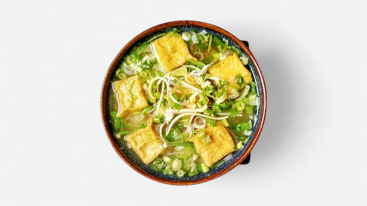 Hovězí vývar , pasta , tenké ryžové nudle čerstvá zelenina , Tofu