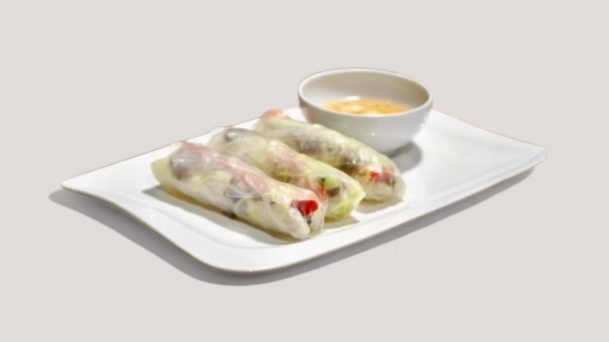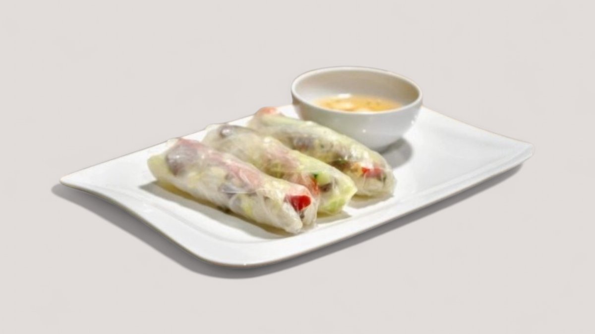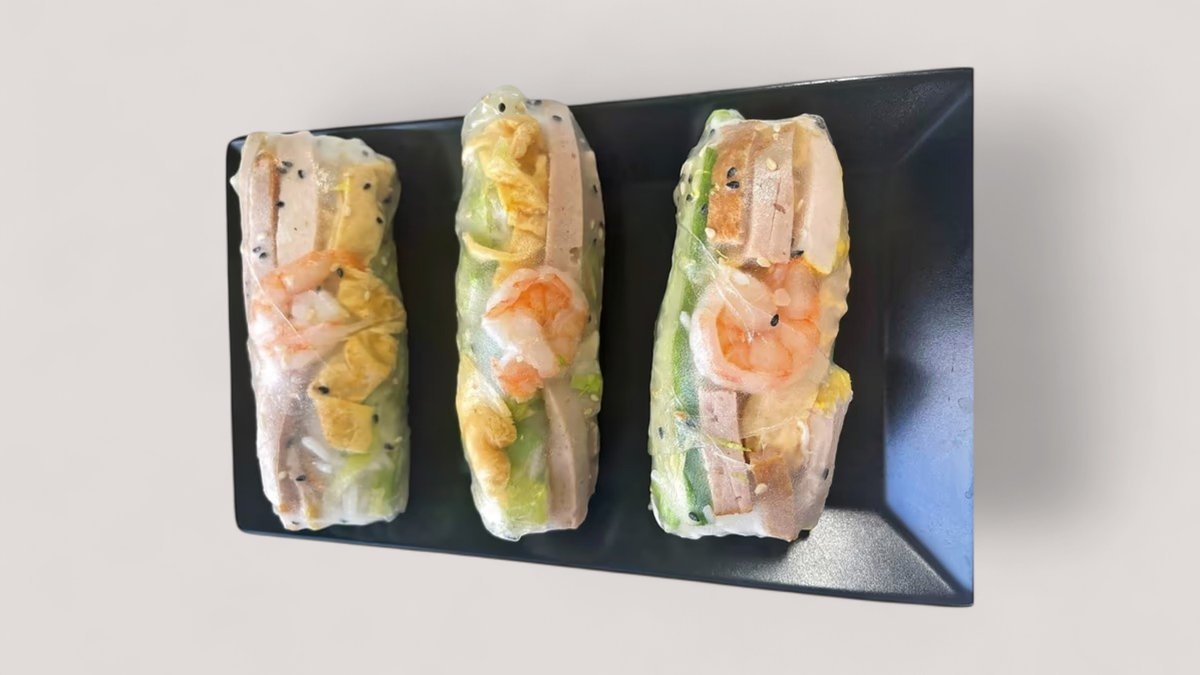 Letní závitky mix s krevetami, skuřecím , hovězím , vajíčko , rýžové nudle , zelenina 3 kusy .