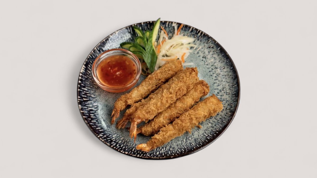 Krevety v křupavém těstíčku se sladkou chili omáčkou s hranolkami